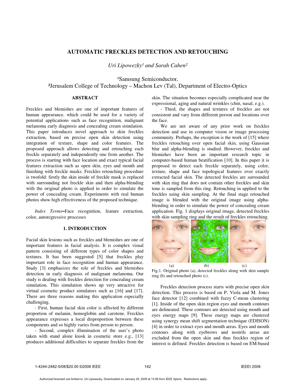 我们不知道之前在计算机视觉或图像处理社区中关于雀斑检测和使用的任何工作。也许,例外的是[15]的工作,在开放的面部皮肤上的雀斑修饰,使用高斯模糊和阿尔法混合进行研究。然而,雀斑和瑕疵一直是基于计算机的人类福祉的一个重要研究课题[10]。本文提出了在精确提取的面部皮肤上,利用颜色、纹理、形状和面部拓扑特征分别检测每个雀斑的方法。检测到的雀斑被不含其他雀斑的皮肤环包围,从该环中取样皮肤色调。使用皮肤取样对雀斑进行修饰。在最后阶段,为了模拟遮瑕膏的功效,使用alphablending将修饰后的图像与原始图像混合。图1显示了原始图像,用皮肤采样环检测到的雀斑和雀斑修饰的结果。