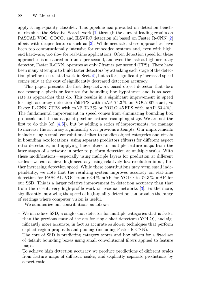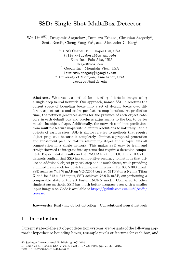 我们引入了SSD,这是一种针对多个类别的单次检测器,比先前的先进的单次检测器(YOLO)更快,并且准确得多,事实上,与执行显式区域提出和池化的更慢的技术具有相同的精度(包括Faster R- CNN)。