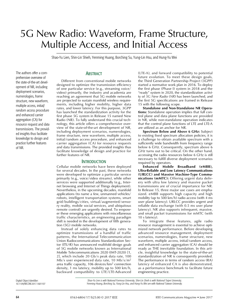 与旨在优化一种特定服务(例如,流式语音/视频)的传输效率的传统移动网络不同,业界和学术界正在达成协议,预计5G移动网络将支持多种无线要求,包括更高的移动性,更高 数据速率和更低的延迟。为此,3GPP已发布第15版第一阶段5G系统的标准化活动,名为New Radio(NR)。为了充分理解这一关键技术,本文全面概述了NR的最新发展,包括部署方案,数字学,帧结构,新波形,多址,初始/随机接入过程和增强型载波 资源请求和数据传输的聚合(CA)。 因此,所提供的见解有助于NR的进一步特征的设计和实践知识。