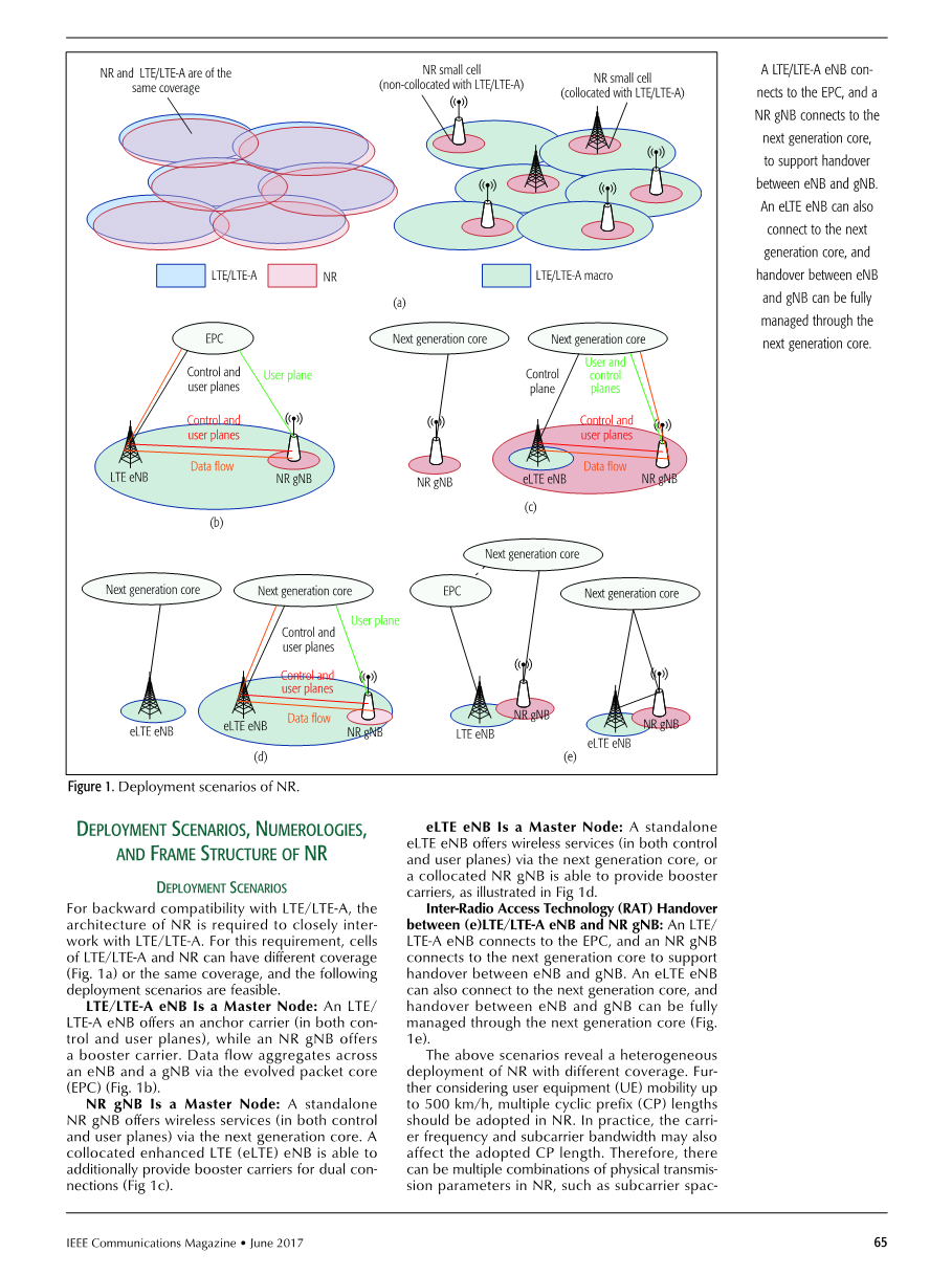 为了与LTE / LTE-A向后兼容,NR的架构需要与LTE / LTE-A紧密互通。 对于此要求,LTE / LTE-A和NR的小区可以具有不同的覆盖范围(图1a)或相同的覆盖范围,并且以下部署方案是可行的。 LTE / LTE-A eNB是主节点:LTE / LTE-A eNB提供锚载波(在控制和用户平面中),而NR gNB提供增强载波。 数据流通过演进分组核心(EPC)在eNB和gNB上聚合(图1b)。NR gNB是主节点:独立的NR gNB通过下一代核心提供无线服务(在控制和用户平面中)。 并置增强型LTE(eLTE)eNB能够另外提供用于双连接的增强载波(图1c)。eLTE eNB是主节点:独立的eLTE eNB通过下一代核心提供无线服务(在控制和用户平面中),或者并置的NR gNB能够提供增强载波,如图1d所示。(e)LTE / LTE-A eNB与NR gNB之间的无线电接入技术(RAT)切换:LTE / LTE-A eNB连接到EPC,并且NR gNB连接到下一代核以支持eNB之间的切换 和gNB。 eLTE eNB还可以连接到下一代核心,并且可以通过下一代核心完全管理eNB和gNB之间的切换(图1e)。