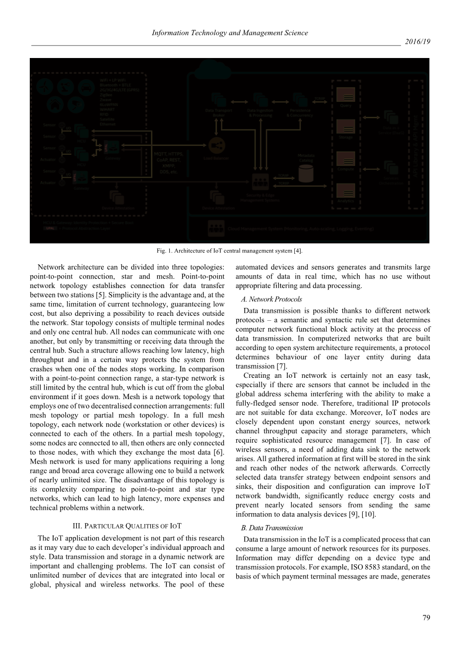 任何物联网结构都包含多个不同的设备和传感器。单个系统中这些组件的数量受到诸多因素的限制,例如设备的输入和输出通道的数量,互联网或电力网络限制负载等。但是,任何不便都可以绕过第三方技术的帮助,例如交换机和路由器,允许在大量物联网设备之间进行数据交换。如今,许多系统依靠云计算来简化基础架构管理逻辑和数据分析。将所有生成的数据发送到中央云资源不仅无效,而且还充满了系统挂起。对于健康监控,紧急响应和其他对延迟敏感的应用程序,将数据传输到云端和返回所导致的延迟是不可接受的。这些情况需要更灵活的工具,例如雾计算,涉及在多个分布式云和网络外围设备中运行的数据处理或分析应用程序的组件,以在资源分配方面获得平衡[11]。尽管如此,物联网网络中的所有设备都使用相同的数据传输协议是非常值得怀疑的,这意味着中央管理系统需要完成额外的数据统一过程,并由此在系统上创建补充负载。它似乎在其通常的制度下工作,只有少数设备连接到物联网,但是更多的设备肯定会降低服务质量。为了最小化网络延迟,系统网络持有者需要组织数据管理序列查询并根据其物联网网络结构仔细修改它们。遗憾的是,查询并不适用于每个系统,尤其是依赖于实际信息的系统。发送和接收之间的暂停可能太长而无法在实时活动中使用数据,只留下两个选项:存储用于历史分析和统计的数据,或者只是为了不必要而将它们丢弃。成功的物联网系统管理要求设备参与者能够离线完成基本程序,功能和数据转换,而无需使用云计算单元或任何其他系统资源。最终,它将导致显着的计算过程加速[7]。