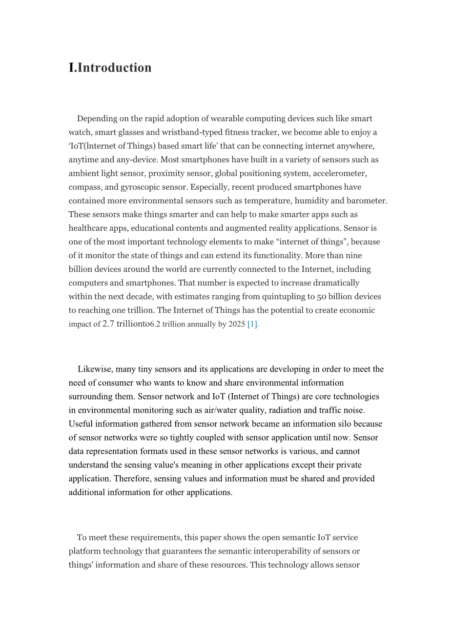 同样,许多微型传感器及其应用程序正在开发中,以满足消费者的需要,谁想知道和分享他们周围的环境信息。传感器网络和物联网是空气/水质、辐射和交通噪声等环境监测的核心技术。由于传感器网络与传感器应用紧密耦合,从传感器网络中获取的有用信息成为信息孤岛。这些传感器网络中使用的传感器数据表示格式是多种多样的,除了它们的私有应用外,无法理解传感值在其他应用中的意义。因此,传感值和信息必须共享,并为其他应用程序提供额外的信息。