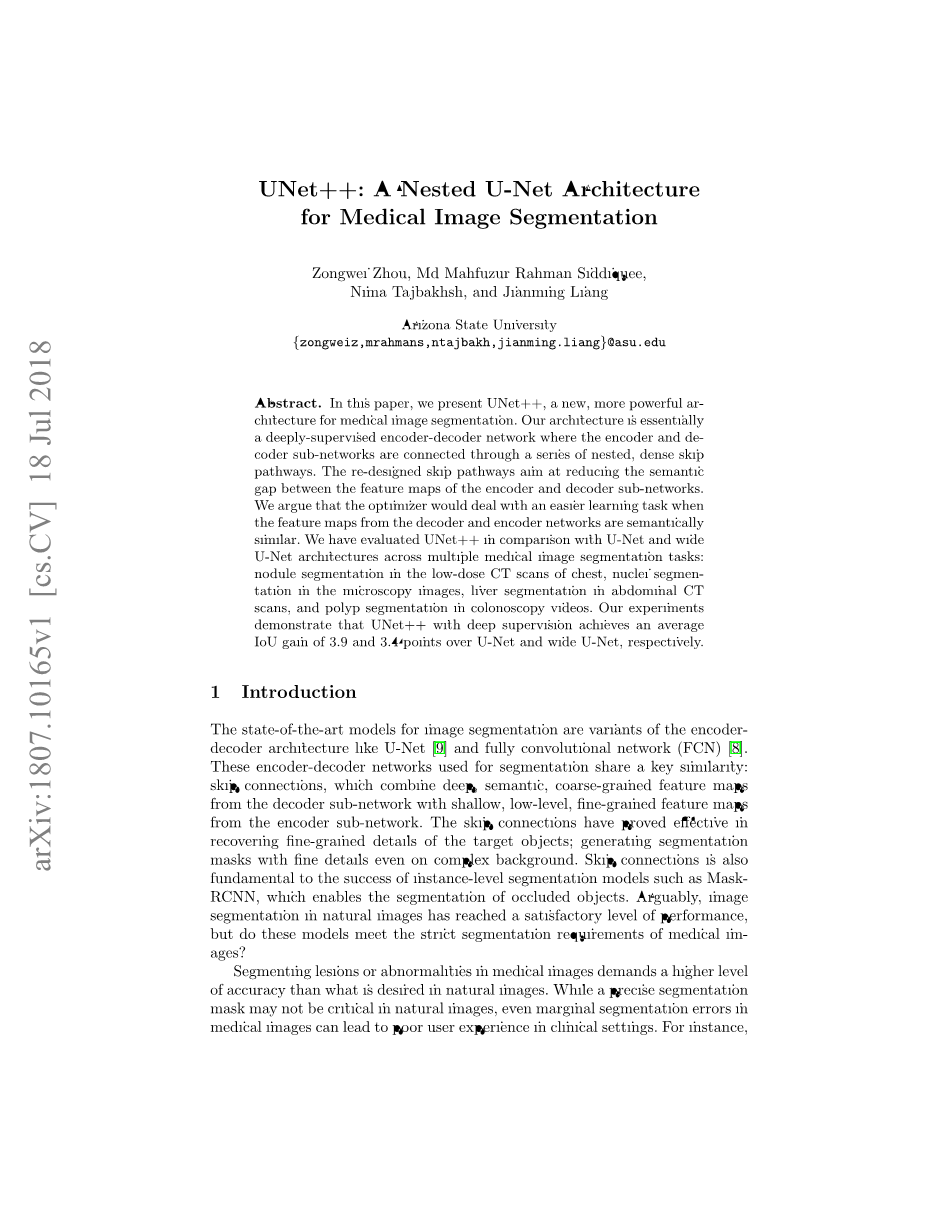 为了满足医学图像中更精确分割的需要,我们提出了UNet ,一种基于嵌套和密集跳过连接的新分割体系结构。我们的架构背后的基本假设是,当来自编码器网络的高分辨率特征图在与来自解码器网络的相应语义丰富的特征图融合之前逐渐丰富时,该模型可以更有效地捕获前景对象的细粒度细节。我们认为当来自解码器和编码器网络的特征映射在语义上相似时,网络将处理更容易的学习任务。这与U-Net中常用的普通跳过连接形成对比,U-Net直接将高分辨率特征映射从编码器快速转发到解码器网络,从而导致语义不同的特征映射的融合。根据我们的实验,建议的架构是有效的,比U-Net和宽U-Net产生显着的性能提升。