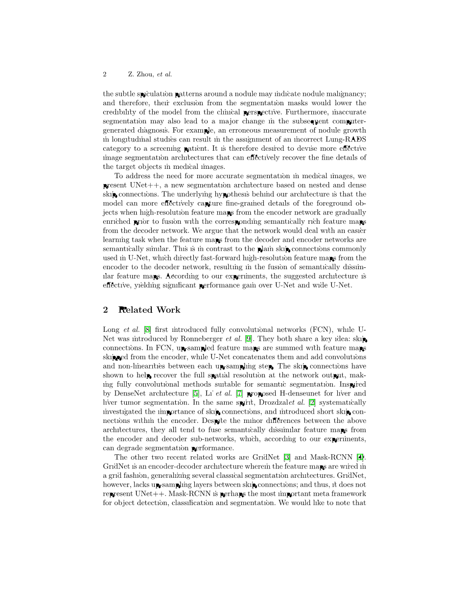 在本文中,我们介绍了UNet ,一种用于医学图像分割的新的,更强大的结构。我们的架构本质上是一个深度监督的编码器 - 解码器网络,其中编码器和解码器子网络通过一系列嵌套的密集跳过路径连接。重新设计的跳过路径旨在减少编码器和解码器子网络的特征映射之间的语义差异。我们认为当来自解码器和编码器网络的特征映射在语义上相似时,优化器将处理更容易的学习任务。我们评估了UNet 与U-Net和广泛的U-Net架构在多个医学图像分割任务中的比较:胸部低剂量CT扫描中的结节分割,显微镜图像中的细胞核分割,腹部CT扫描中的肝脏分割和结肠镜检查视频中的息肉分割。我们的实验证明深度监督的UNet 分别比U-Net和宽U-Net实现了3.9和3.4点的平均IoU增益。