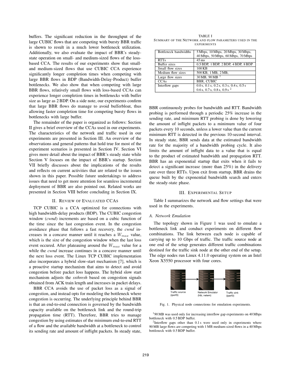 本文的其余部分安排如下:第二部分简要概述了我们实验中使用的CCA。 我们的实验中使用的网络和交通的特征在第III节中给出。 大多数实验场景的观测和一般模式的概述见第四节。 第六部分详细介绍了BBR稳态的影响,第五部分则重点介绍了BBR创业的影响。 第七部分简要讨论了结果的影响和反映当前与本文所示问题相关的活动。 还指出了未来可能采取的措施,以解决需要更多关注BBR无缝增量部署的问题。 相关工作见第八节,然后在第九节结束。