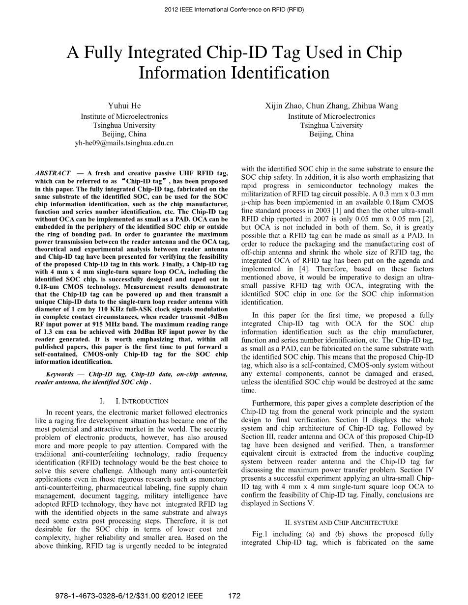 本文提出了一种新颖的无源超高频RFID标签,即“芯片身份证明标签”。在所识别片上芯片的同一衬底上制作的完整集成ID芯片标签,可用于片上系统芯片的信息识别,如芯片制造商、功能和序列号识别等。没有OCA(Optical Clear Adhesive)光学胶的ID芯片标签可以像片板一样小。光学胶可嵌入所识别的片上系统芯片外围或焊盘环外。为了保证读写器天线与OCA标签之间的最大功率传输,本文对读写器天线与ID芯片标签之间的功率传输进行了理论分析和实验分析,验证了本文提出的ID芯片标签的可行性。最后,利用0.18 um 的CMOS技术成功地设计了一种4mmtimes;4mm单匝方环OCA芯片,包括所识别的片上芯片。测量结果表明,ID芯片标签可以启动,然后发送一个独特的ID芯片数据单匝线圈阅读器天线的直径1厘米的110 KHz的ASK时钟信号调制在完全接触的情况下,当读者传播9 dbm,射频输入功率在915 MHz频带。读取器产生20dBm射频输入功率,最大读取范围1.3 厘米。值得强调的是,在所有已发表的论文中,本文首次提出了一种自包含的、仅限CMOS芯片的片上芯片信息标识标签。