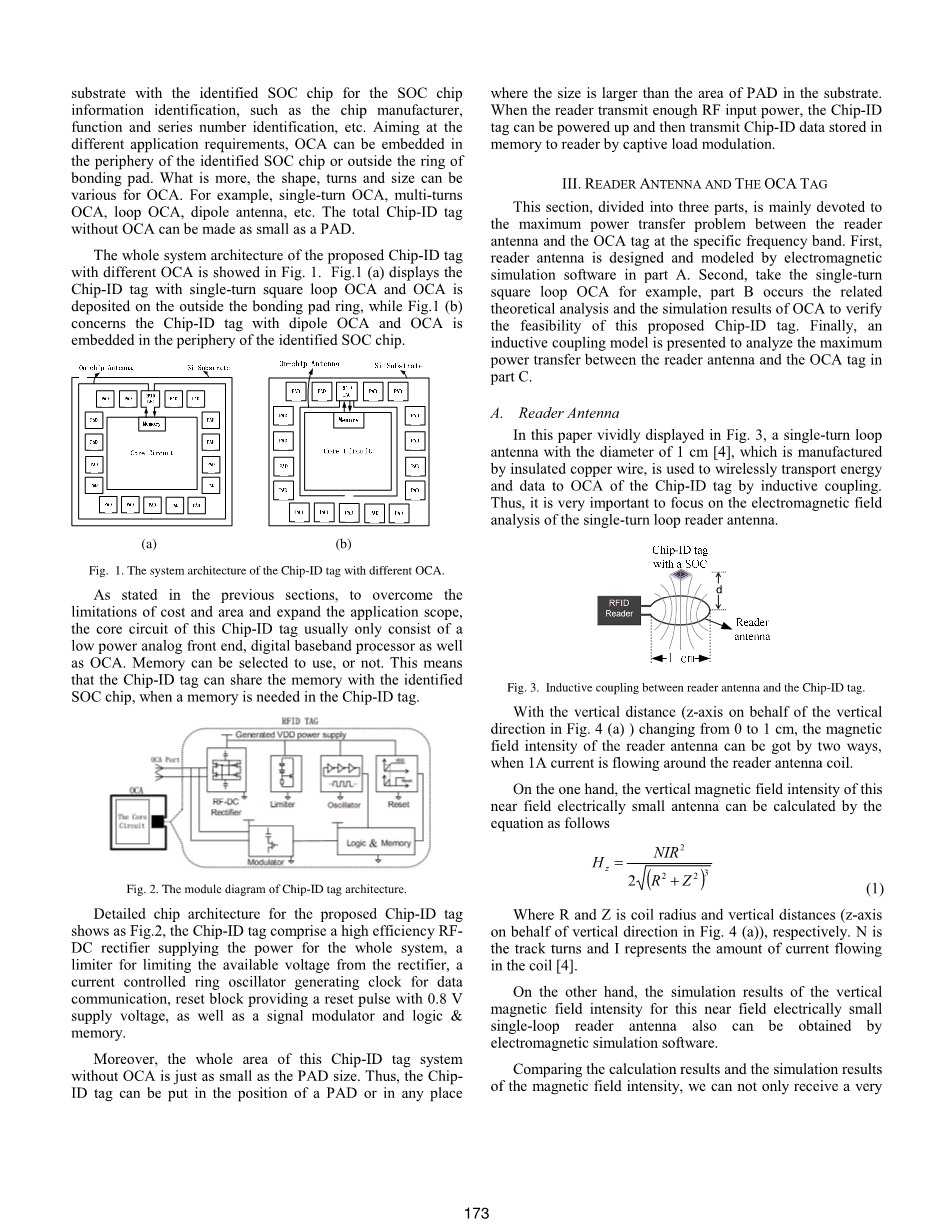 图1包括(a)和(b)展示了所提出的完全集成ID芯片标签,该标签与所识别的片上芯片在同一衬底上制作,用于片上芯片的信息识别,如芯片制造商、功能和序列号识别等。针对不同的应用要求,可以将OCA嵌入到所识别的片上芯片外围或键合板环外。更重要的是形状、转弯和大小可以不同的OCA。例如单匝OCA、多匝OCA、环路OCA、偶极天线等。没有OCA的芯片ID标签可以做成一个片板那么小.。