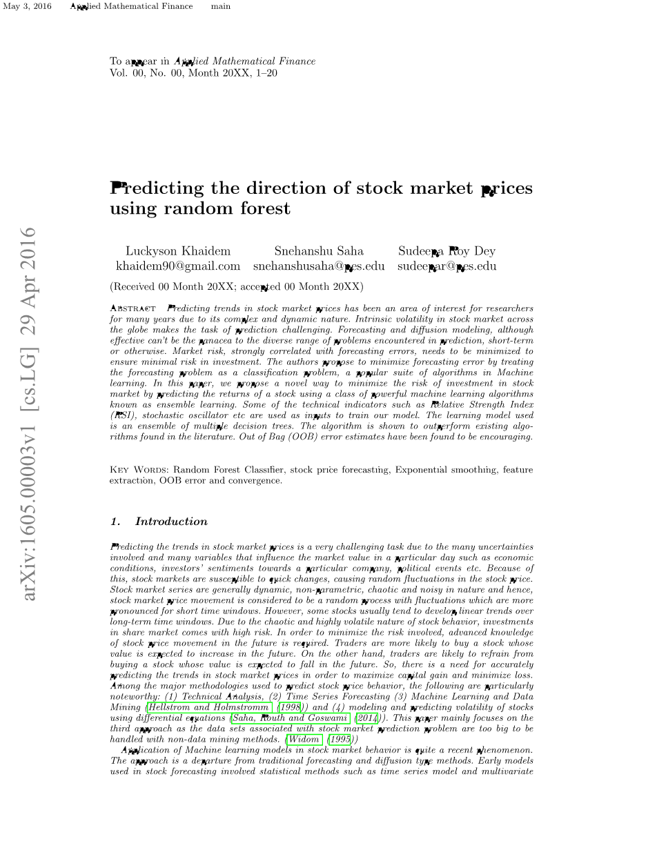 股票市场价格走势预测由于其复杂性和动态性,多年来一直是研究人员感兴趣的领域。全球股市的内在波动使得预测任务具有挑战性。尽管有效的预测和扩散模型不能解决预测中遇到的各种各样的问题,无论是短期的还是其他的。市场风险与预测误差具有很强的相关性,需要将其最小化,以确保投资风险最小化。本文提出将预测问题作为分类问题来处理,使预测误差最小化,分类问题是机器学习中常用的一套算法。在本文中,我们提出了一种新的方法来最小化投资股票市场的风险,通过预测股票的回报使用一类强大的机器学习算法称为集成学习。采用相对强度指数(RSI)、随机振荡器等技术指标作为训练模型的输入。所使用的学习模型是一个多决策树的集合。结果表明,该算法优于已有的算法。