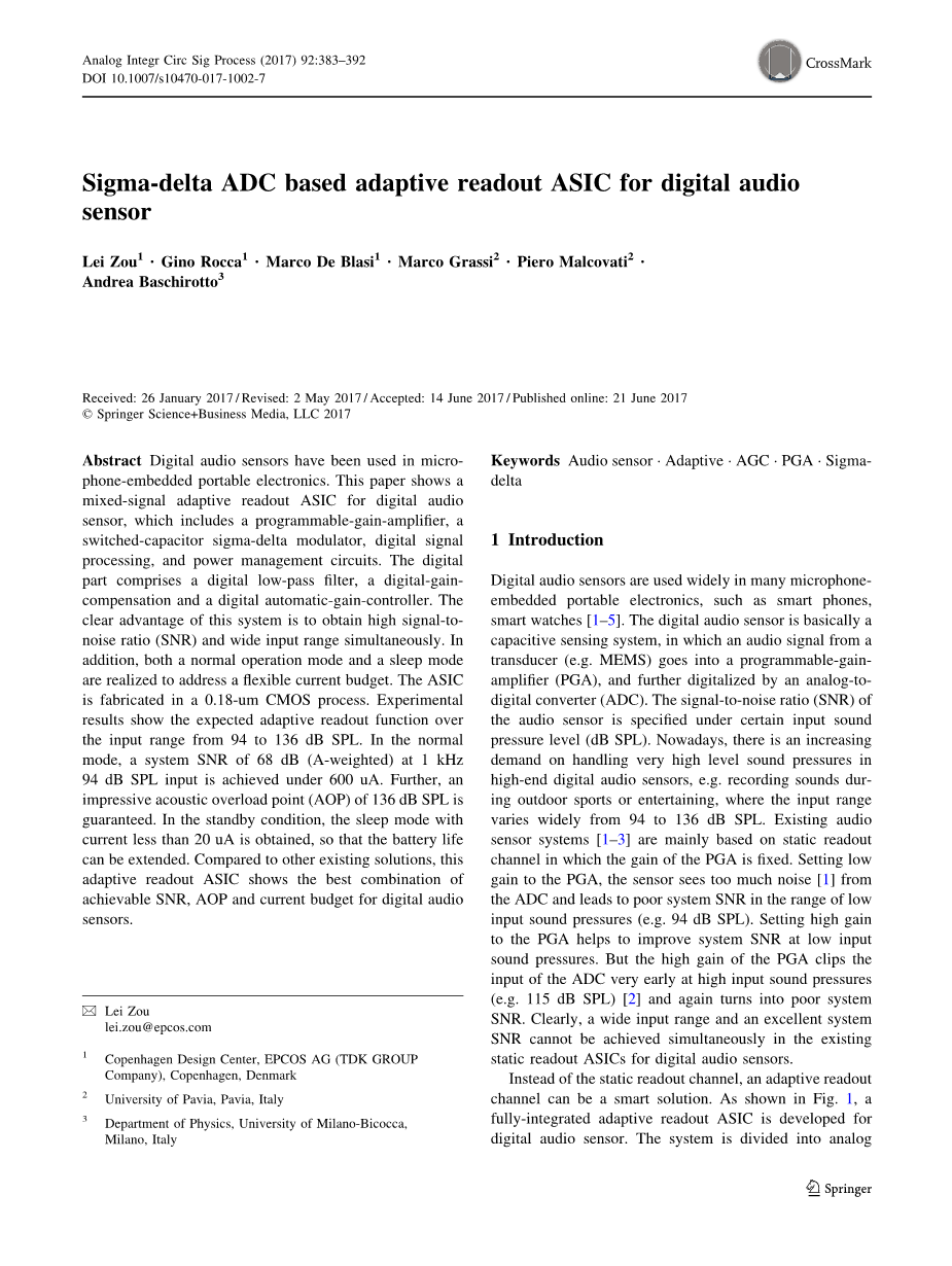 数字音频传感器已被应用于微型手机嵌入式便携式电子设备中。摘要介绍了一种数字音频传感器的混合信号自适应读数ASIC,其中包括可编程增益放大器、开关电容式sigma-delta调制器、数字信号处理和电源管理电路。数字部分包括一个数字低通滤波器,一个数字增益补偿和一个数字自动增益控制器。该系统的明显优点是同时获得高信噪比(SNR)和带宽输入范围。此外,还实现了正常的操作模式和睡眠模式,以灵活的解决当前预算问题。ASIC是在一个0.18-umCMOS工艺中制造的。实验结果表明,期望自适应读出函数在94到136 dB SPL的输入范围。在正常模式下,在1 kHz 94 dB SPL输入下,系统SNR为68 dB(a-加权),在600uA下实现。此外,保证了136 dB SPL的令人印象深刻的声过载点(AOP)。在待机状态下,获得了电流小于20 uA的睡眠模式,从而延长了电池寿命。与其他现有的解决方案相比,这种自适应读出ASIC显示了可实现的SNR、AOP和数字音频传感器的当前预算的最佳组合。