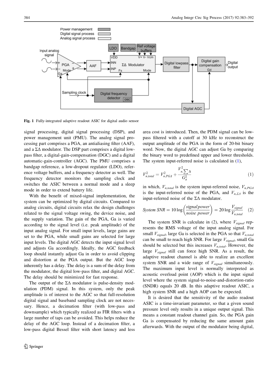 数字音频传感器广泛应用于许多麦克风——嵌入式便携式电子设备,如智能手机、智能手表1-5。数字音频传感器基本上是一种电容感应系统,在这种系统中,来自传感器(如MEMS)的音频信号进入可编程增益放大器(PGA),并通过模拟-数字转换器(ADC)进一步数字化。音频传感器的信噪比(SNR)是在一定的输入声压级(dB SPL)下指定的。如今,在高端数字音频传感器中,对高水平声音压力的需求越来越大,例如,在户外运动或娱乐中记录声音,输入范围在94到136 dB SPL之间有很大的差异。现有的音频传感器系统1-3主要基于静态读出通道,在这个通道中,PGA的增益是固定的。将低增益设置为PGA,传感器从ADC中看到太多的噪声,并导致低输入声压力范围内的系统SNR(例如94分贝SPL)。在低输入声压力下,为PGA设定高增益有助于改善系统的SNR。但是,PGA的高增益在高输入声压力(如115 dB SPL)2的早期,就会将ADC的输入信号转换为糟糕的系统SNR。显然,在现有的数字音频传感器的静态读数asic中,不能同时实现一个广泛的输入范围和一个优秀的系统SNR。与静态读出通道不同的是,自适应读数通道可以是一个智能解决方案。如图1所示,为数字音频传感器开发了一个完整的自适应读数ASIC。系统被分为模拟信号处理,数字信号处理(DSP)和电源管理单元(PMU)。模拟信号的处理部分包括一个PGA,一个抗混叠滤波器(AAF)和一个调制器。DSP部分包括一个数字低通滤波器,一个数字增益补偿(DGC)和一个数字自动增益控制器(AGC)。PMU包括一个带隙参考,一个低退出的调节器(LDO),请参考电压缓冲器和频率检测器。