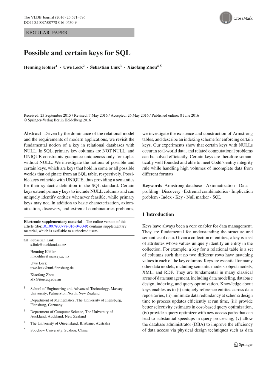 在关系模型的主导地位和现代应用程序的要求的驱动下,我们重新审视了关系数据库中具有NULL的密钥的基本概念。在SQL中,主键列是NOT NULL,UNIQUE约束仅保证没有NULL的元组的唯一性。我们研究了可能和某些键的概念,这些键分别是源自SQL表的一些或所有可能世界中的键。可能的键与UNIQUE重合,从而为SQL标准中的语法定义提供语义。某些键扩展主键包括NULL列,并且可以在可行时唯一地标识实体,而主键可以不会。除了基本特征描述,公理化,发现和极端组合问题,我们研究了Armstrong表的存在和构造,并描述了用于强制执行某些键的索引方案。我们的实验表明,某些具有NULL的键出现在实际数据中,并且可以有效地解决相关的计算问题。因此,某些密钥具有良好的基础,能够满足Codd的实体完整性规则,同时处理来自不同格式的大量不完整数据。