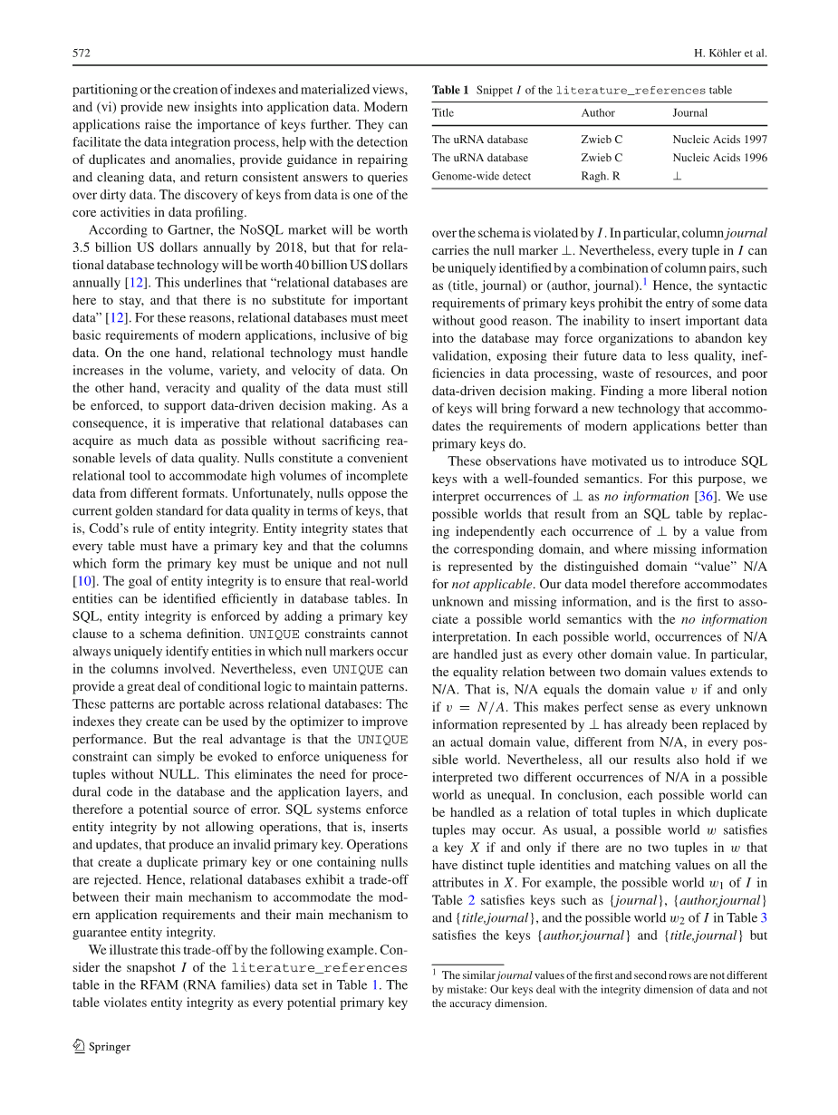 我们通过以下示例来说明这种权衡。在表1中的RFAM(RNA系列)数据集中,包含了arts_references表的快照I。该表违反了实体完整性,因为I违反了模式上的每个潜在主键。特别是,列日志带有空标记perp;。尽管如此,I中的每个元组都可以通过列对的组合进行唯一标识,例如(标题,期刊)或(作者,期刊).因此,句法主键要求禁止在没有充分理由的情况下输入某些数据。无法将重要数据插入数据库可能会迫使组织放弃密钥验证,将其未来数据暴露于质量较低,数据处理效率低下,资源浪费和数据驱动决策不良的情况。找到更自由的密钥概念将带来一种新技术,它比主键更能满足现代应用程序的要求。这些观察结果促使我们引入具有良好基础语义的SQL密钥。为此,我们将occurrence的出现解释为无信息[36]。我们使用SQL表中产生的可能世界,通过相应域中的值独立地替换每次出现的perp;,并且缺失信息由区分域“值”N / A表示不适用。因此,我们的数据模型可以容纳未知和缺失的信息,并且是第一个通过无信息解释来分析可能的世界语义。在每个可能的世界中,N / A的出现与每个其他域值一样被处理。特别是,两个域值之间的等式关系延伸到N / A。也就是说,当且仅当v = N / A时,N / A等于域值v。这是完全合理的,因为在每个可能的世界中,由represented代表的每个未知信息已经被不同于N / A的实际域值所取代。然而,如果我们将可能世界中两种不同的N / A解释为不相等,我们的所有结果也都成立。总之,每个可能的世界都可以作为可能发生重复元组的总元组的关系处理。像往常一样,当且仅当w中没有两个元组具有不同的元组标识并且在X中的所有属性上匹配值时,可能的世界w满足键X.例如,表2中的I的可能世界w1满足{journal},{author,journal}和{title,journal}等密钥,以及表3中I的可能世界w2满足密钥{author,journal}和{title,journal},但违反了密钥{journal}。特别是,世界w1模拟了Genom广泛检测的纸张的情况。由Ragh,R尚未在期刊上发表。如果需要,我们还可以规定密钥的最低要求。