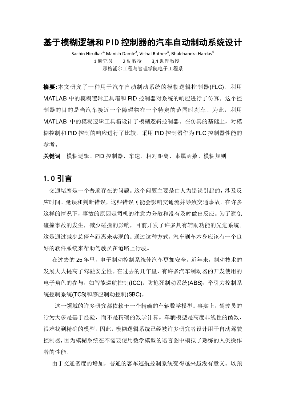 基于模糊逻辑和PID控制器的汽车自动制动系统设计外文翻译资料 2021-11-07 22:46:01 英语原文共 17 页 英语原文共 20 页 原文和译文剩余内容已隐藏,您需要先支付 30元 才能查看原文和译文全部内容!立即支付 发小红书推广免费获取该资料资格。点击链接进入获取推广文案即可: Ai一键组稿 | 降AI率 | 降重复率 | 论文一键排版 PREVIOUS NEXT 您可能感兴趣的文章 看边界:边界感知面部对齐算外文翻译资料 看边界:边界感知面部对齐算外文翻译资料 一种支持分布式正态智能监控的多代理体系结构外文翻译资料 增强的无线局域网协作MAC外文翻译资料 近眼显示器的绝对辐射和光度测量外文翻译资料 红外遥控系统外文翻译资料 一幅单一图像中雨滴去除的专注生成对抗性网络外文翻译资料 深度残差学习在图像识别中的应用外文翻译资料 低成本,便携式室内环境质量监测装置的设计与开发外文翻译资料 使用基于查询蓝牙的RSSI概率分布进行室内定位外文翻译资料