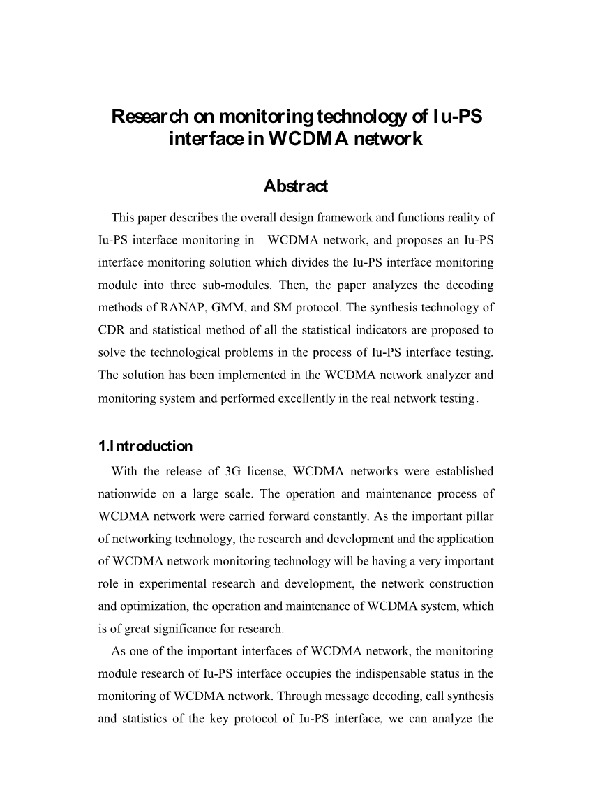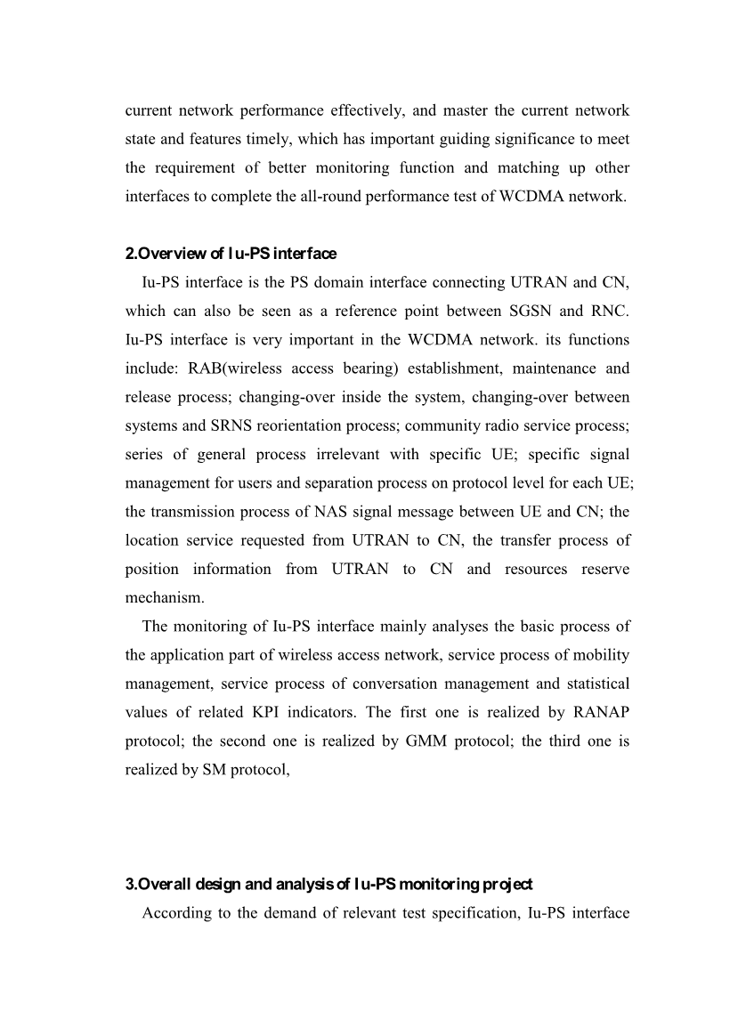本文介绍了WCDMA网络中Iu-PS接口监控的总体设计框架和功能,提出了一种Iu-PS接口监控解决方案,将Iu-PS接口监控模块划分为三个子模块。然后,本文分析了RANAP,GMM和SM协议的解码方法。为了解决Iu-PS 接口测试过程中的技术问题,提出了CDR的综合技术和所有统计指标的统计方法。该解决方案已在WCDMA网络分析仪和监控系统中实施,并在真实的网络测试中表现出色。