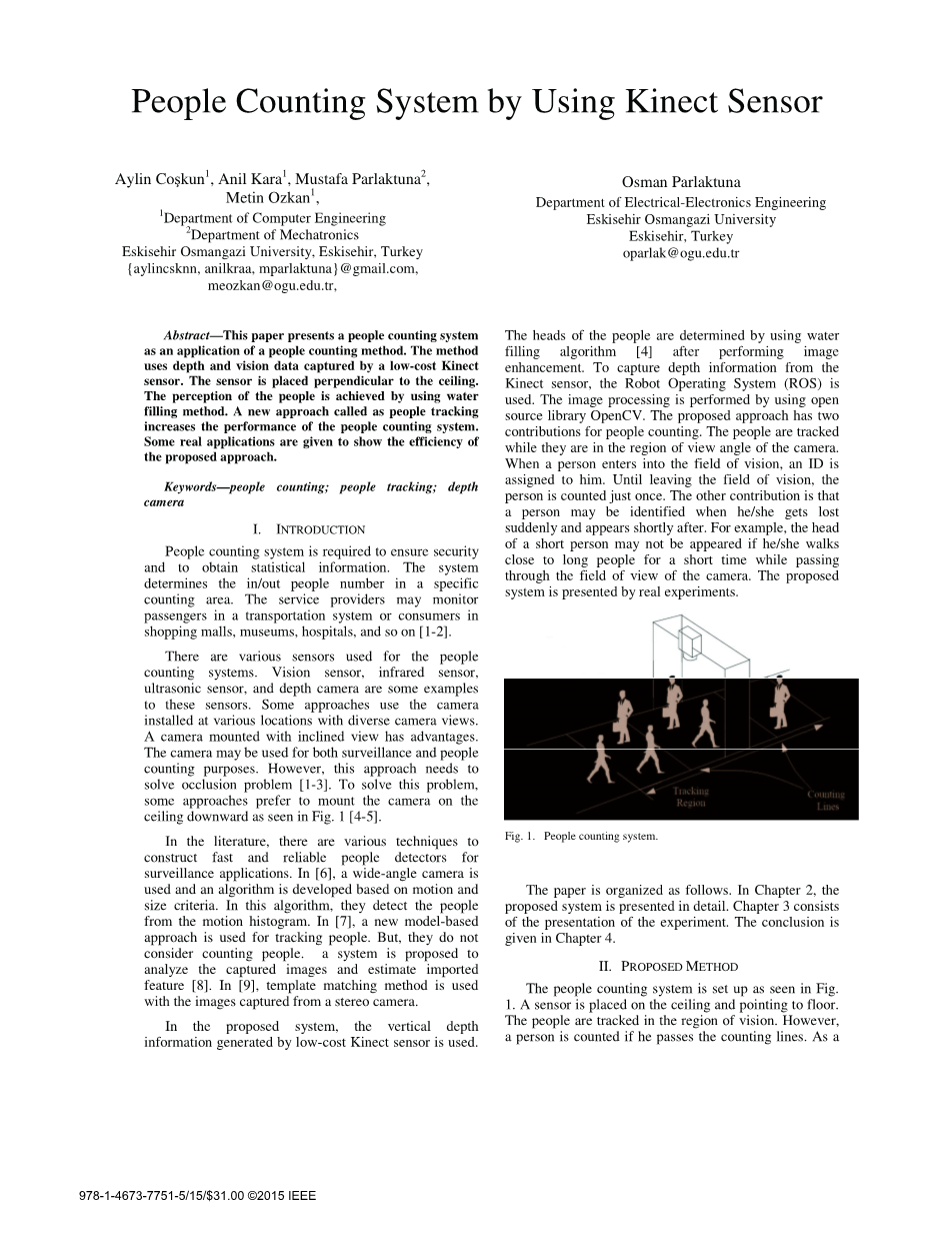 摘要 - 本文提出了一种人数统计系统作为人数统计方法的应用。该方法使用由低成本Kinect传感器捕获的深度和视觉数据。传感器垂直于天花板放置。通过使用注水方法实现对人的感知。称为人员跟踪的新方法提高了人数统计系统的性能。给出了一些实际应用以显示所提出方法的效率。