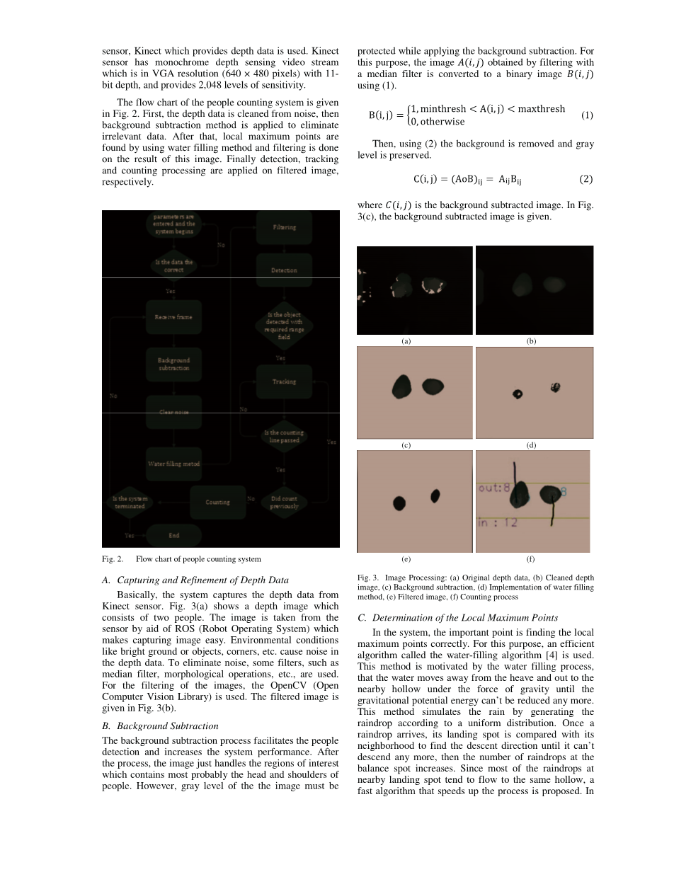 在执行图像增强之后,通过使用注水算法[4]来确定人的头部。为了从Kinect传感器捕获深度信息,使用机器人操作系统(ROS)。使用开源库OpenCV执行图像处理。拟议的方法有两个人数计算的贡献。当人们处于摄像机视角的区域时,人们被跟踪。当一个人进入视野时,会为他分配一个身份证。在离开视野之前,这个人只算一次。另一个贡献是,当他/ 她突然迷路并且不久后出现时,可以识别出一个人。例如,如果他/她在穿过摄像机的视野时短时间走近长人,则可能不会出现短人的头部。所提出的系统通过真实实验呈现。