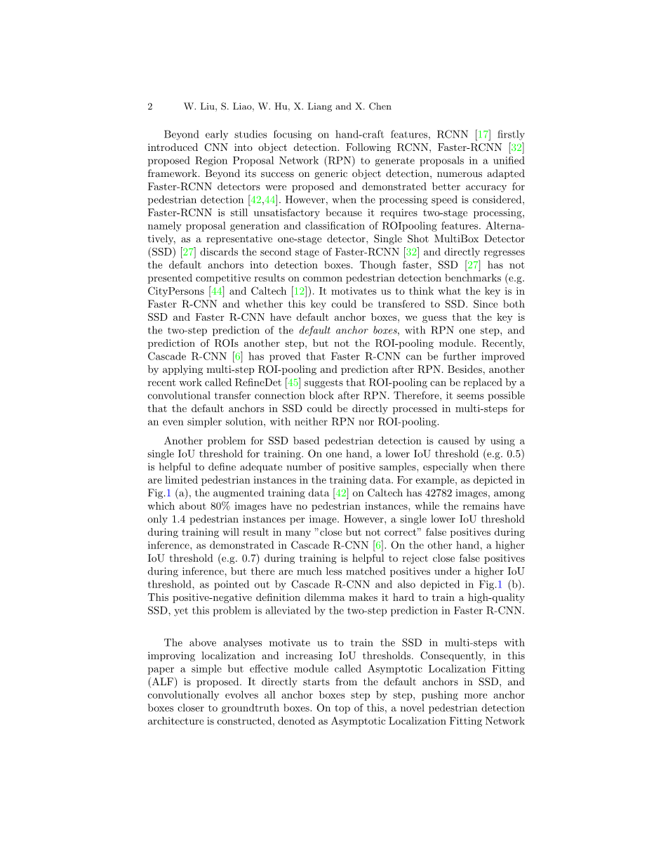 除了专注于手工艺特征的早期研究之外,RCNN [17]首先将CNN引入物体检测。在RCNN之后,Faster-RCNN [ 32 ]提出了区域提案网络(RPN)在统一框架中生成提案。除了其上通用对象检测成功,大量适于更快-RCNN探测器被提出并实现了更高的精确度对行人检测[42,44]。然而,当考虑处理速度时,Faster-RCNN仍然不能令人满意,因为它需要两阶段处理,即提议生成和ROIpooling特征的分类。或者,作为代表性的单级检测器,单次多盒检测器(SSD)[27]丢弃Faster-RCNN [32] 的第二阶段,并直接将默认锚点回归到检测框中。虽然速度更快,但SSD[27]并未在常见的行人检测基准测试中提供有竞争力的结果(例如CityPersons [44]和Caltech [12])。它激励我们思考更快的R-CNN中的关键是什么,以及这个密钥是否可以转移到SSD。由于SSD和更快的R-CNN都有默认的锚箱,我们猜测关键是默认锚箱的两步预测,RPN是一步,ROI预测是另一步,而不是ROI池模块。最近,Cascade R-CNN [6]已经证明通过在RPN之后应用多步ROI池和预测可以进一步改善更快的R-CNN。此外,另一项名为RefineDet [45]的最新研究表明,在RPN之后,ROI池可以被卷积传输连接块取代。因此,似乎可以在多步骤中直接处理SSD中的默认锚点,以获得更简单的解决方案,既没有RPN也没有ROI。