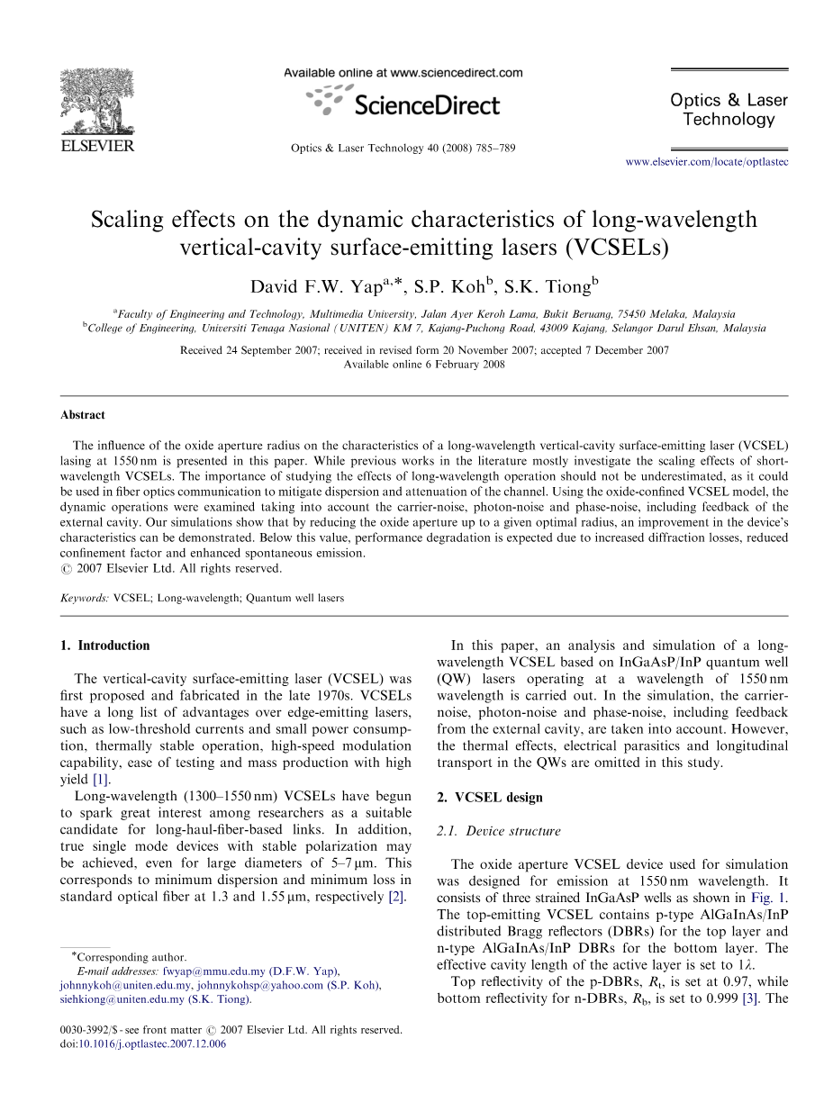 本文介绍了氧化物孔径半径对激光波长为1550 nm的长波垂直腔面发射激光器(VCSEL)特性的影响。虽然文献中的先前工作主要研究短波长VCSEL的尺度效应。不应低估研究长波长操作影响的重要性,因为它可用于光纤通信以减轻信道的色散和衰减。使用氧化物限制的VCSEL模型,检查动态操作,同时考虑载波噪声,光子噪声和相位噪声,包括外腔的反馈。我们的模拟表明,通过将氧化物孔径减小到给定的最佳半径,可以证明器件特性的改善。低于该值时,由于增加的衍射损耗,限制因子减少和自发发射增强,预期性能下降。