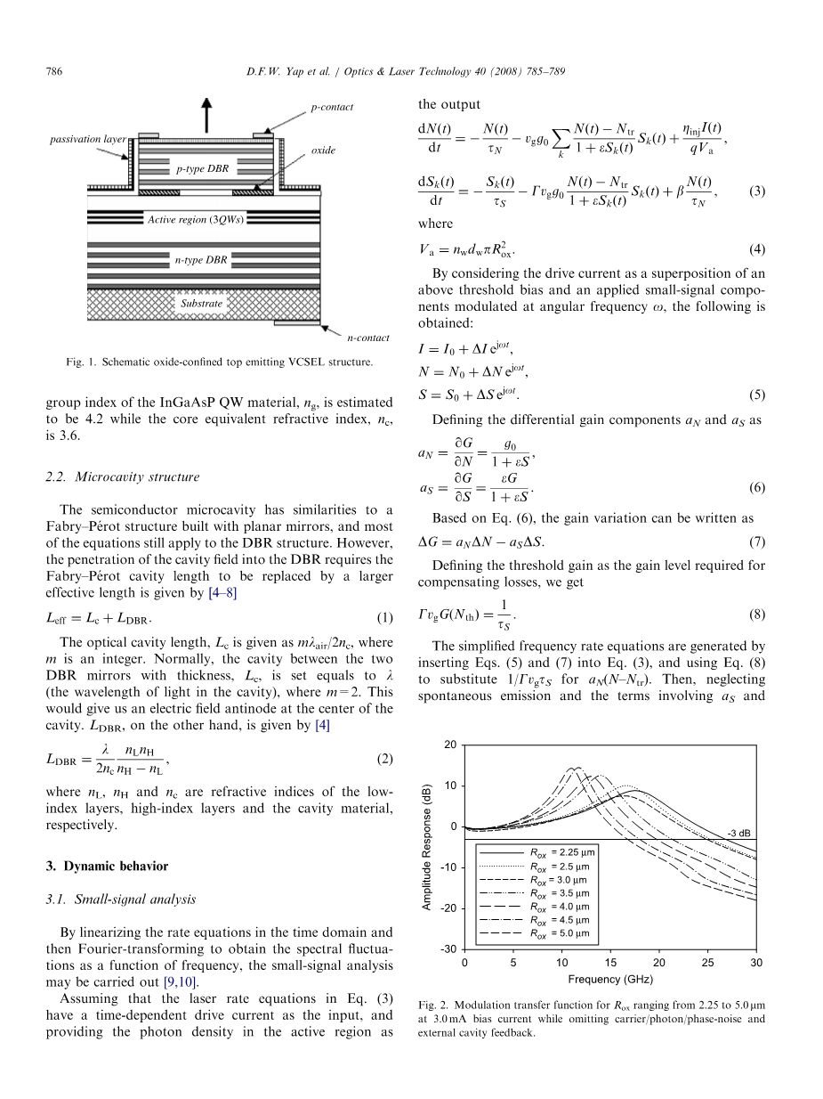 图3将归一化调制响应计算为式(10)后偏置电平的函数。它是观察到,氧化的孔径半径,为2.25,2.5~3.0 mm的带宽超过25 GHz,而较大的器件显示调制带宽减少。Liu等人也得到了类似的结Al-Omair等人基于式子[12]的微型酶模拟器分别进行短波长的实验工作VCSELs。它们都证明了a调制带宽显著增加缩径氧化孔径。