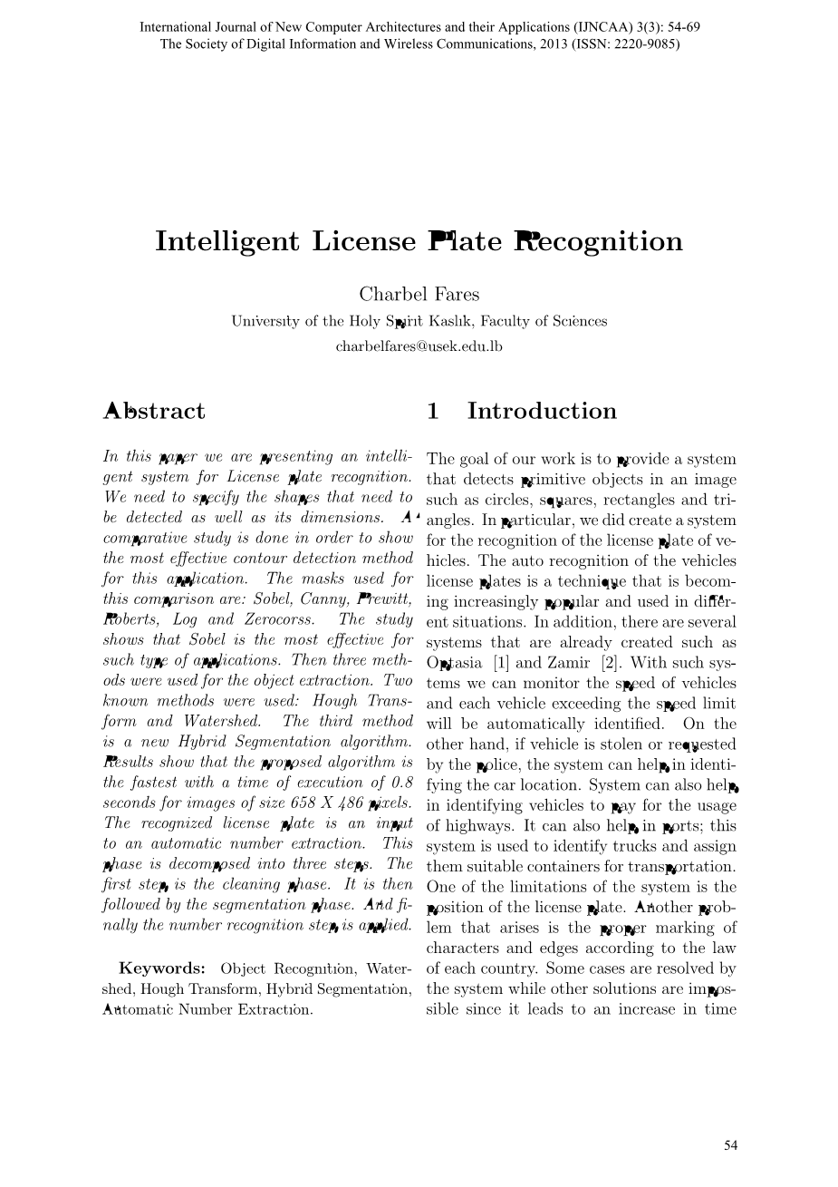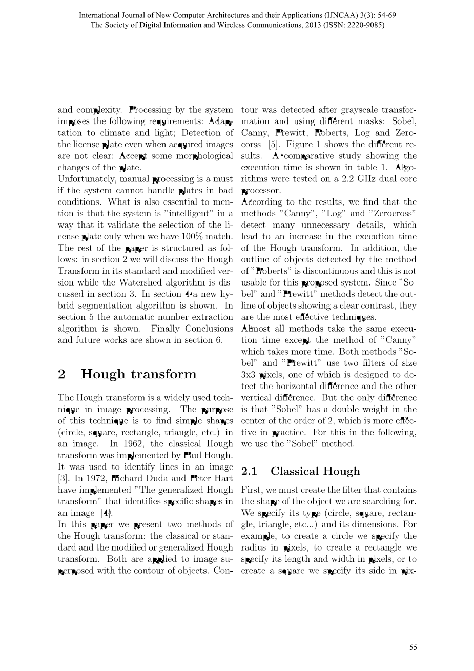 我们的工作目标是提供一个系统来检测图像中的原始对象,如圆、正方形、矩形和三角形。特别的是,我们建立了一套用于车辆牌照识别的系统。车牌自动识别技术是一种在不同情况下日益普及和应用的技术。此外,已经创建了几个系统,如Optasia[1]和Zamir[2]。有了这样的系统,我们可以监控车辆的速度,超过速度限制的车辆将自动识别。另一方面,如果车辆被盗或被警方要求,该系统可以帮助识别车辆的位置。该系统还可以帮助识别使用高速公路的车辆。它还可以帮助港口;该系统用于识别卡车并为其分配适合运输的集装箱。该系统的局限性之一是车牌的位置。另一个问题是根据每个国家的法律对文字和边缘进行适当的标记。。有些情况是由系统解决的,而其他的解决方案是不可能的,因为它会导致时间和复杂性的增加。系统的处理强加了以下要求:适应气候和光;车牌检测,即使获取的图像不清晰;接受板块的一些形态变化。不幸的是,如果系统不能在恶劣的条件下处理车牌,手工处理是必须的。同样重要的是,这个系统是智能的,它只在我们100%匹配的情况下才会验证车牌的选择。本文其余部分的结构如下:在第2节中,我们将讨论霍夫变换的标准和修改版本,而在第3节中,我们将讨论分水岭算法。第四节给出了一种新的混合分割算法。第5节给出了自动数字提取算法。最后的结论和未来的展望将在第6节说明。