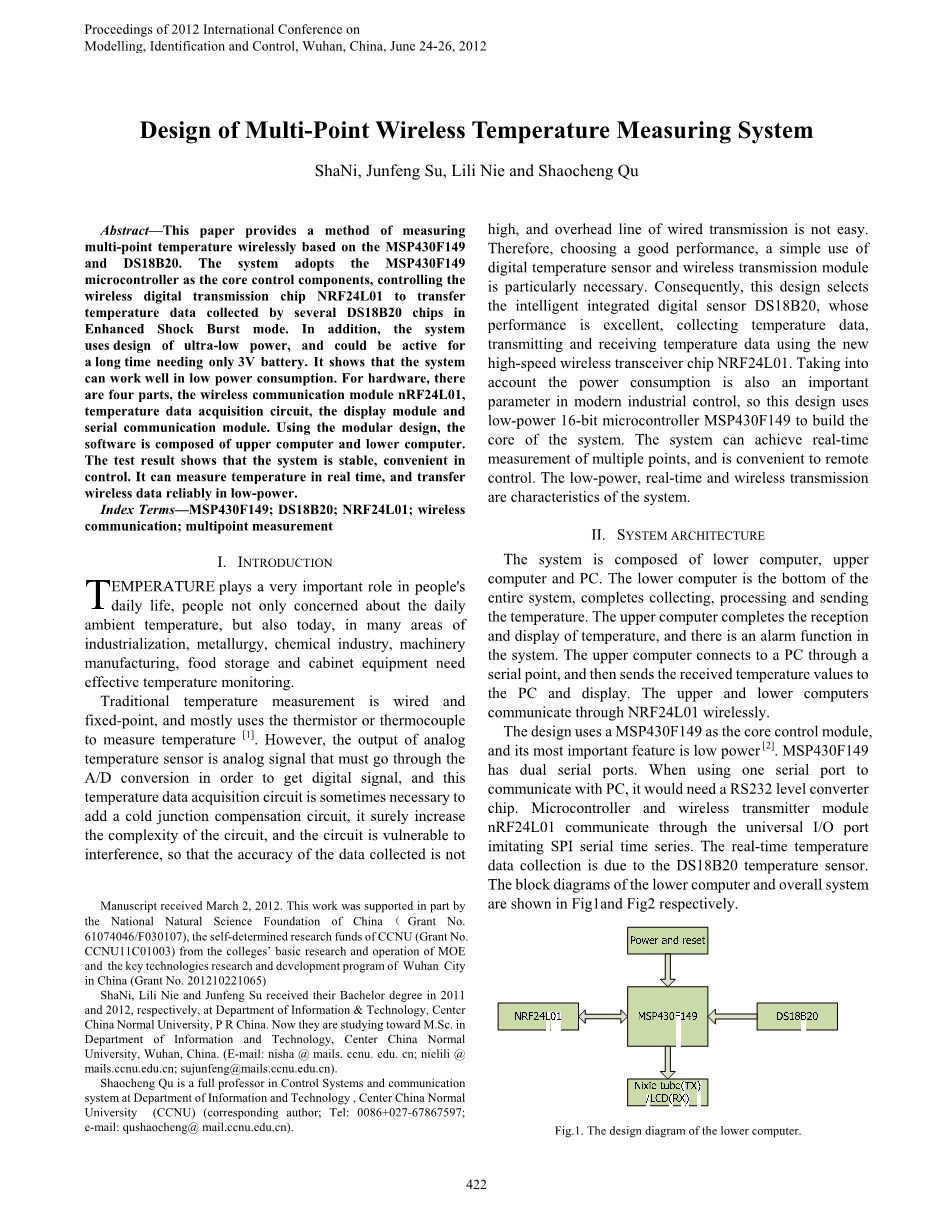 关键词 MSP430F149;DS18B20;NRF24L01;无线通信;多点测量