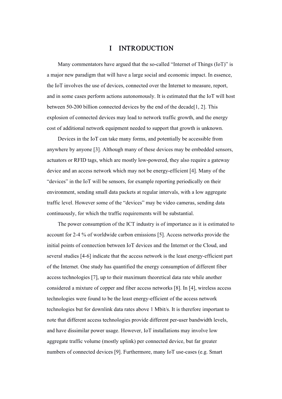 物联网中的设备可以有多种形式,任何人都可以从任何地方访问它们。虽然这些设备中的许多可能是嵌入式传感器、执行器或RFID标签,它们大多是低功耗的,但它们也需要网关设备和接入网,而接入网可能不是节能的[4]。物联网中的许多“设备”将是传感器,例如定期报告其环境,定期发送小数据包,总体流量水平较低。然而,一些“设备”可能是摄像机,不断地发送数据,因此对流量的要求将是巨大的。
