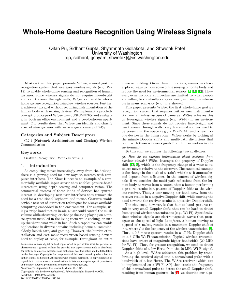 本文介绍了WiSee,这是第一个全家庭手势识别系统,既不需要用户仪器也不需要摄像机的基础功能。怀斯做到了这一点,它在环境中利用无线信号(如Wi-Fi)。因为这些信号不需要视线,可以穿过墙壁,几乎没有信号源需要出现在空间中(例如,Wi-Fi AP和一些移动设备客厅的设备)。怀斯通过观察来自人体运动的无线信号例如微小的多普勒频移和多径畸变来产生变化。