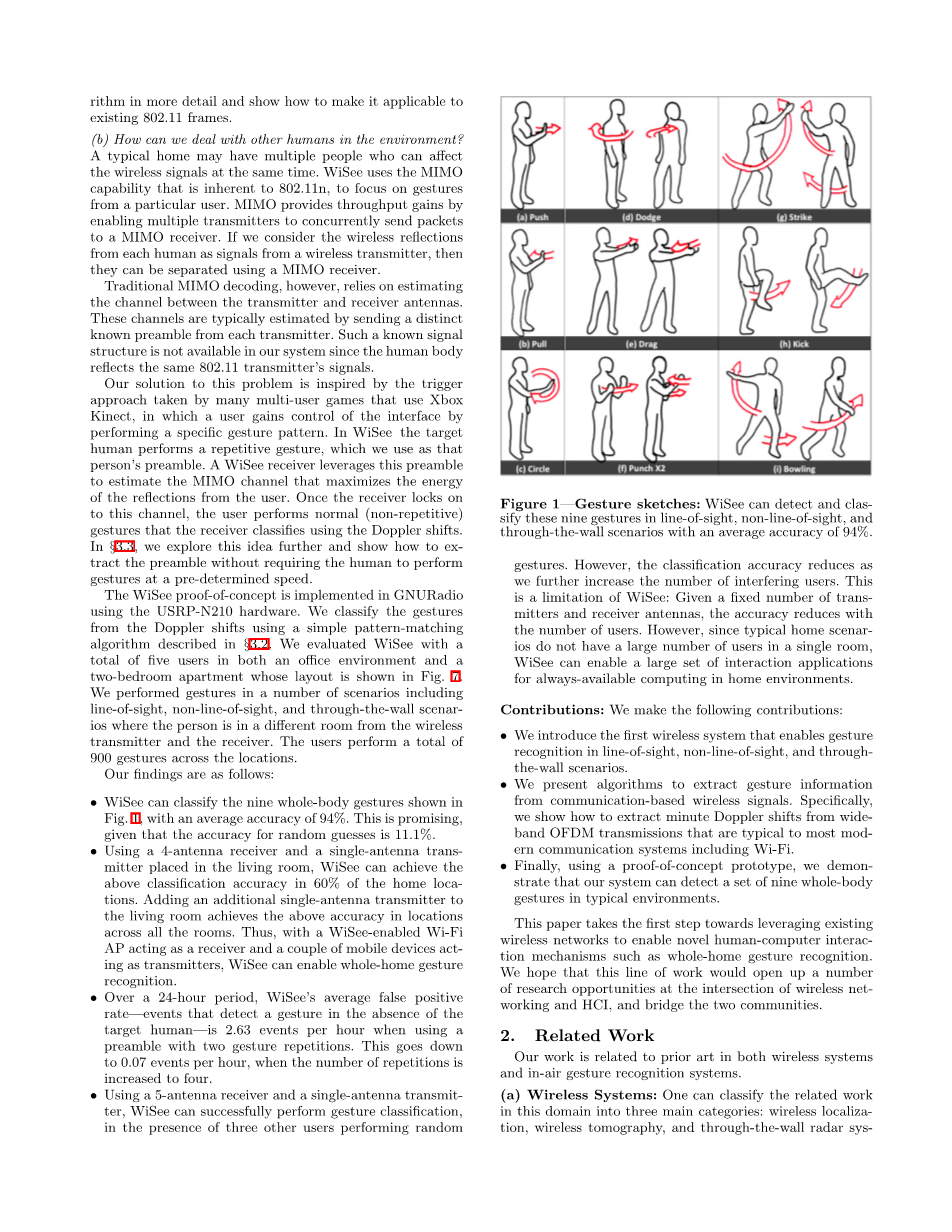 (a)无线系统:可以对相关工作进行分类。在这个领域分为三大类:无线定位,无线断层扫描和穿墙雷达系统-TEMS。先前的本地化工作使用了各种技术定位无线设备,包括,rssi[6],细粒度OFDM信道信息[21]和多天线[26]。最近也有人对无设备本地化感兴趣。使用无线RSSI信息的人类[28,20]设备。怀斯建立在这项基础工作的基础上,但与之互补的是,它专注于实现人类使用无线信号的手势识别。怀斯还与无线断层扫描相关旨在通过部署传感器网络来定位人类整个环境[29,25,24]。这些系统通常使用在每个传感器上观察到的RSSI值定位人类。怀斯建立在这项工作的基础上,但明显不同它从无线信号中提取多普勒频移进行手势识别。此外,我们还证明可以进行全方位的手势识别每个房间都不需要无线设备。最后,怀斯与穿墙有关。雷达系统[4,18,3]可识别物体,如墙后的金属钉。这些系统使用昂贵的超宽带按以下顺序使用带宽的收发器:1 GHz〔4〕。相比之下,怀斯则专注于手势识别。演示如何从无线设备中提取手势信息传输。最接近我们在这个领域的工作是最近的证明使用Wi-Fi可行性的工作[5]检测穿墙情况的信号。然而,据我们所知,以前的雷达都没有系统设计用于手势识别。相反,Wise引入了使其能够超越人类的粗野动作,比如跑步和走路,并提供第一个能够识别更精细的人体运动,如在直瞄、非直瞄以及穿墙场景。