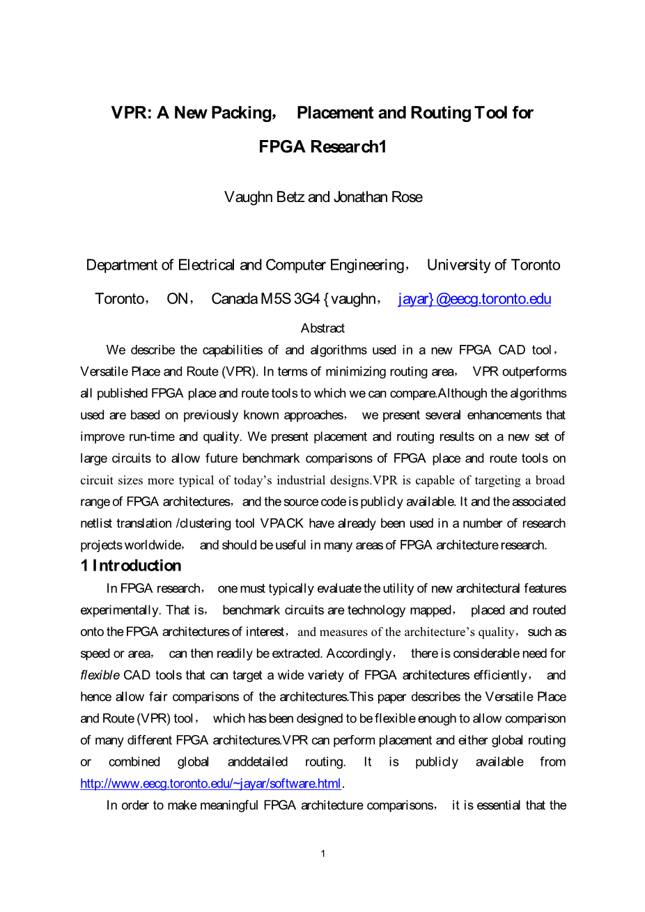 在FPGA的研究中,人们通常必须评估新结构特色的实用工具而做评估实验。也就是说评估基准电路技术映射,放置和FPGA的布线结构上的关系和措施的架构质量,如运算速度或区域,然后可以很容易地提取出来。因此,有相当大的对于灵活CAD工具的需求,这样才可以针对各种架构的FPGA做高效的设计,从而便于比较均匀的设计架构。本文介绍了通用的地点和路线(VPR)工具,设计很灵活,足够让许多FPGA架构的比较VPR可以执行的位置,要么全球路由或合并后的全球详细路由。这是公开的http://www.eecg.toronto.edu/〜jayar/软件。