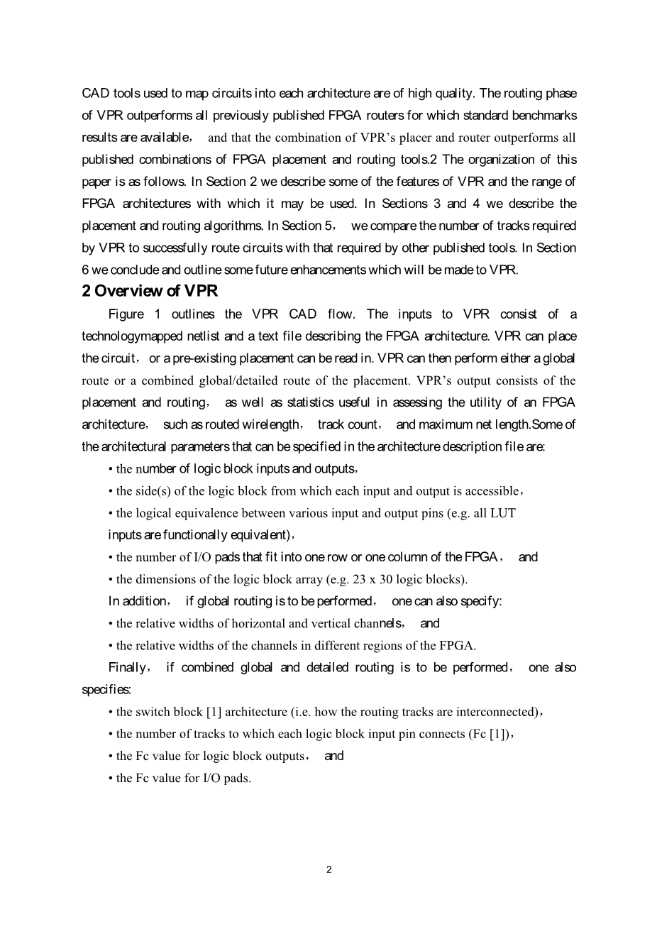 在第2节我们描述了一些VPR功能的FPGA架构和范围与它可能被使用的地方。在第3和第4节,我们描述了布局布线法。在第5节讲述了比较有必要的VPR曲目数量和该电路成功的布线所要求的其他已发表的工具。在第6节得出了我们的结论,并提出一些VPR将来的升级。