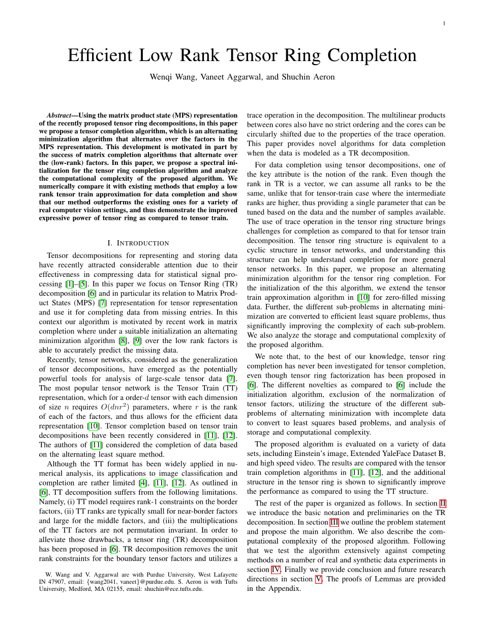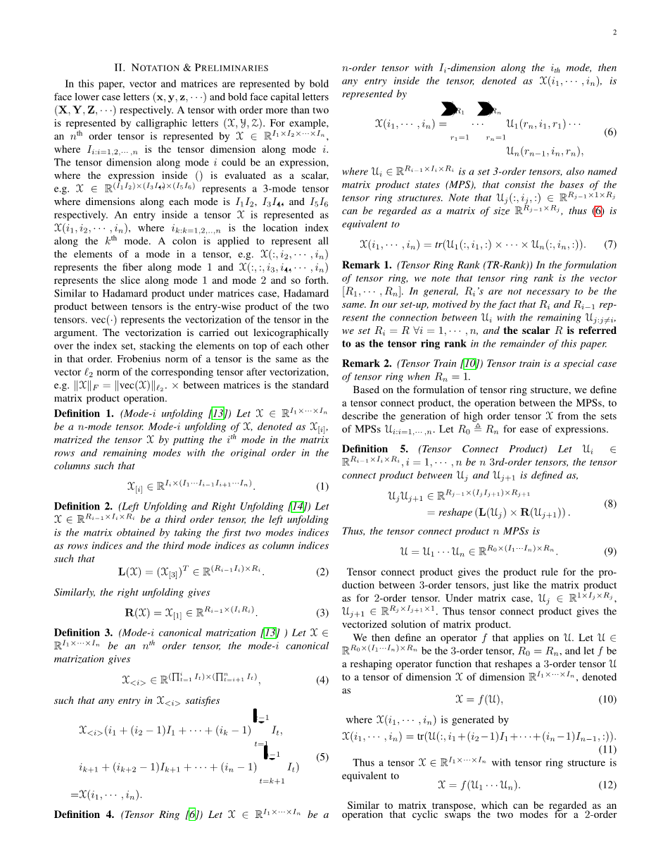 本文的其余部分安排如下。 在部分 II 我们介绍了关于TR分解的基本符号和预备。 在部分 III 我们概述了问题陈述并提出了主要算法。 我们还描述了该算法的计算复杂度。 接下来,我们将对该算法进行广泛的测试,以针对部分实际和合成数据实验中的竞争方法 IV. 最后我们提供结论和未来的研究方向 V. 附录提供了引证的证明。
