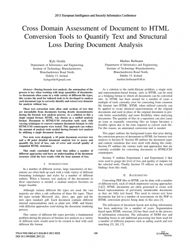 在取证文本分析中,在处理大量文档时,过程的自动化是关键。由于文档通常具有各种不同的文件类型,因此需要开发定制工具来分析每个文档,并且正确地识别提取的元素以便进行分析而不会丢失。这些文本提取工具通常会省略文档中无法读取的文本部分,在法医文本分析过程中会出现严重的不一致。作为这种解决方案,单一输出格式HTML被选为统一的分析格式。对HTML / CSS提取工具的文档进行了测试,每个工具都有不同的技术将常见文档格式转换为丰富的HTML / CSS对应文件。这种方法可以通过利用单一文档格式减少法医文本分析期间所需的分析工具的数量。设计了两个测试,一个10点文档概述测试和一个48点详细文档分析测试,以评估和量化输出HTML结构的损失程度,错误率和整体质量。本研究的结论是,利用多种不同方法并对文档结构有所了解的工具可以在损失最少的情况下获得最佳结果。