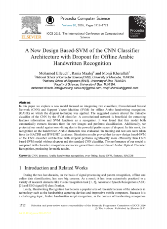 考虑到离线手写体数字笔迹的识别,我们的研究突出并强调了识别方面。由于形状,凹度,曲率和笔画的差异,手写字符和重叠字符是高度变化的。出于这个原因,我们对识别错综复杂的手写体数字给予了高度的关注和重视。由于这项工作,基于CNN和SVM的分类器的架构被应用到手写体数字。另一方面,在本研究中,为防止我们的架构过度拟合并改善其性能,应用了神经元丢弃技术。该技术包括临时从网络中删除单元。仅在训练阶段中随机选择该移除的单元。该架构混合了下面描述的两种方法的优点。
