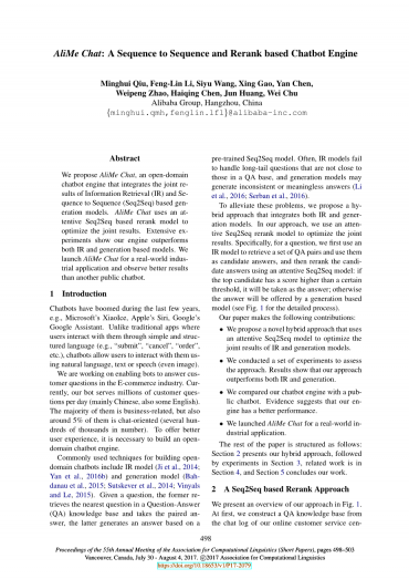 我们推出了AliMe聊天,一个开放领域的聊天机器人引擎,它将信息检索(IR)的联合结果和序列到序列(Seq2Seq)的生成模型相结合。 AliMe聊天使用基于序列到序列的重排模型来优化联合结果。大量的实验证明我们的引擎比IR和生成模型都要出色。我们推出了AliMe聊天,以实现真实的工业应用,并获得比其他公共聊天机器人更好的结果。