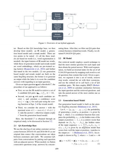 用于构建开放域的聊天机器人的常用技术包括IR模型(Ji et al., 2014; Yan et al., 2016b)和生成模型((Bahdanau et al., 2015; Sutskever et al., 2014; Vinyals and Le, 2015)。给定一个问题,前者在问答(QA)知识库中检索最接近的问题,并接受成对的答案,后者根据预先训练的序列到序列模型生成答案。通常,IR模型无法处理在QA库中不相近的长尾问题,并且生成模型可能产生不一样的或没有意义的答案(Li et al., 2016; Serban et al., 2016)。