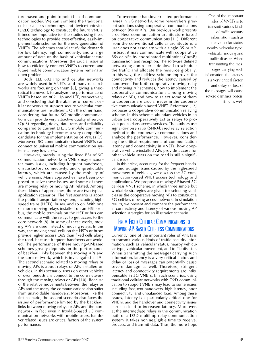 在本文中,考虑到汽车高速运动导致的频繁切换和通信中断问题,我们讨论了5G车联网接入技术及其应用,提出了一个基于移动接入点的5G无蜂窝车联网方案,给出了选择车辆担任协作移动接入点的三个简单有效的原则,来构建一个5G无蜂窝移动接入网络。在仿真结果中,我们提出并比较了不同移动接入点选择方法下的连通性和时延,并选择出了最佳方案。
