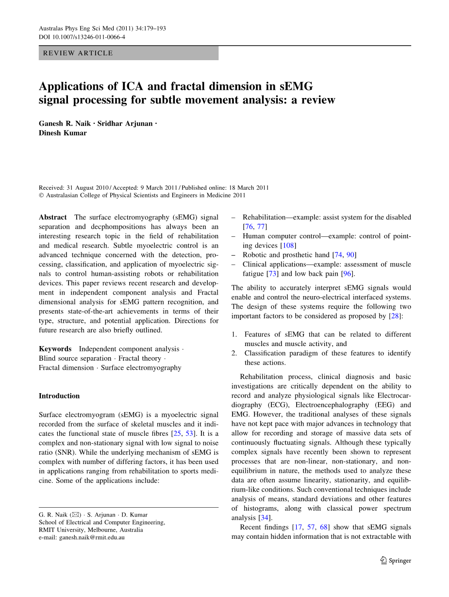 ICA和分形维数在肌电信号处理中的微妙运动分析应用:综述外文翻译资料