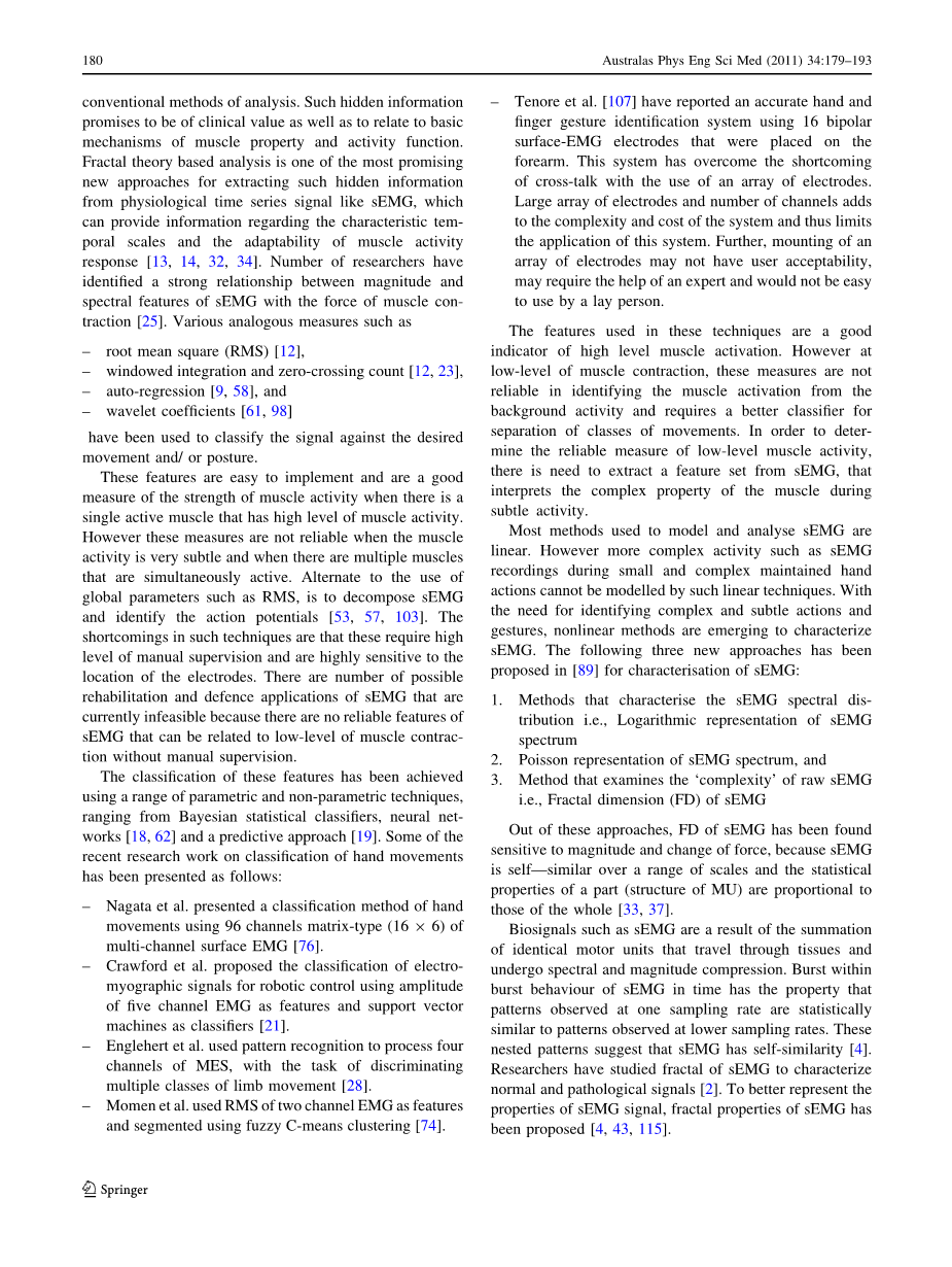 最近的发现[17,57,68]表明,表面肌电信号可能包含隐藏的信息,这些信息不能用传统的分析方法提取。这些隐藏信息具有临床价值,并与肌肉性质和活动功能的基本机制有关。基于分形理论的分析是从生理时间序列信号中提取隐藏信息的最有前途的新方法之一,如肌电信号,可以提供有关特征时间尺度和肌肉活动反应适应性的信息[13,14,32,34]。 研究人员已经确定肌电图的幅度和光谱特征与肌肉收缩力之间的强关系[25]。各种类似的措施如: