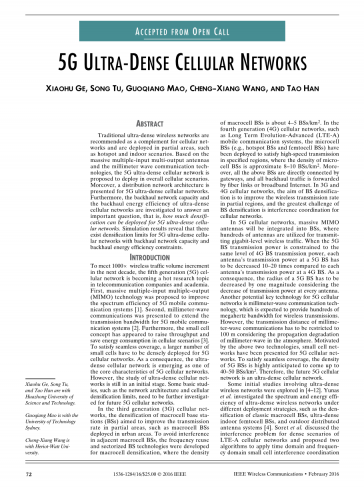在5G蜂窝网络中,大规模MIMO天线将集成到BS中,其中数百个天线用于传输千兆级无线流量。当5GBS传输功率受到限制每个4G BS传输功率相同天线在5G BS的传输功率有与每个相比减少10-20倍天线在4G BS的传输功率。作为一个结果,5G BS的半径必须是考虑到这一点,减少一个等级降低每个天线的发射功率。5G蜂窝的另一个潜在关键技术网络是毫米波通信技术,预计将提供数百个用于无线传输的兆赫带宽。但是,必须限制毫米波的通信传输距离考虑到传播退化,100米在大气中的毫米波。启发通过上述两种技术,为5G蜂窝网络提供了小型蜂窝网络。为了满足无缝覆盖,密度人们高度期待5G BS的出现40-50 BSs / km2。因此,未来的5G蜂窝网络是一种超密集的蜂窝网络。一些涉及超密集的初步研究在[4-12]中探讨了无线网络。 Yunas等。研究了超密集无线网络的频谱和能量效率不同的部署策略,例如经典宏蜂窝BS的分类,超密集室内femtocell BSs,室外分布式天线系统[4]。索雷特等人。讨论了密集场景的干扰问题LTE-A蜂窝网络提出了两种算法应用时域和频域小小区干扰协调用于密集的无线网络[5]。基于LTE和WiFi技术,联合协调的小区内和小区间资源分配机制被提议机会性地利用净工作密度作为资源[6]。但是,这些解决方案主要针对4G蜂窝网络网络,例如LTE网络。 Bhushan等。讨论了网络密集化的优势,其中包括空间致密化,例如,密集部署小细胞和光谱聚合,即利用更大的部分用于5G网络的各种频段的无线电频谱[7]。而且,在这种致密的网络架构中,小型小区的密集部署是仅限于室内场景;户外用户情景仍然被传统的宏观细胞所覆盖。通过家庭演进的NodeB吸收机器类型通信(MTC)流量,一个新的架构被提出使用小型电池处理大规模密集的MTC推出[8]。如[7,8]所述,这些密集无线网络是现有的补充宏蜂窝网络。考虑到中国的回程交通挑战