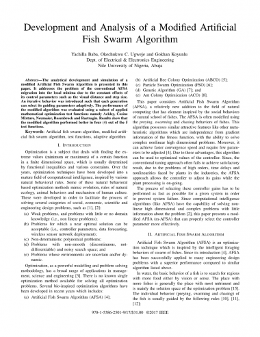 摘要:本文提出了一种改进的人工鱼群算法的分析和仿真。它解决了传统AFSA迁移到局部最小值的问题,这是由于其控制参数(例如视距和步长)的恒定影响。引入迭代行为,使得每一代可以自适应地选择其引导参数。使用应用的数学优化测试函数的子集即Ackley,Cosine Mixture,Neumaier,Rosenbrock和Rastragin来评估修改的算法的性能。结果表明,修改后的算法在5个测试函数中的四(4)个中表现更好。