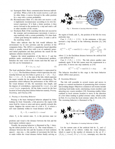 食物满足度(适合度)由Yi = f(xi)表示。代表任何两条鱼之间关系的欧氏距离给出为。对于i = 1,2,...,N,Xi是鱼的状态,它代表所考虑问题的目标变量。 影响AFSA性能的参数是鱼的视距,最大步长和拥挤程度,分别由视觉,步长和拥挤度因素表示。所有鱼类都使用三种不同的行为来寻找食物的最佳位置,即捕食,聚群和追尾[10]。