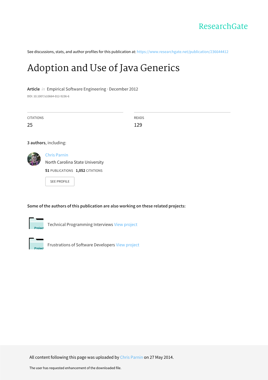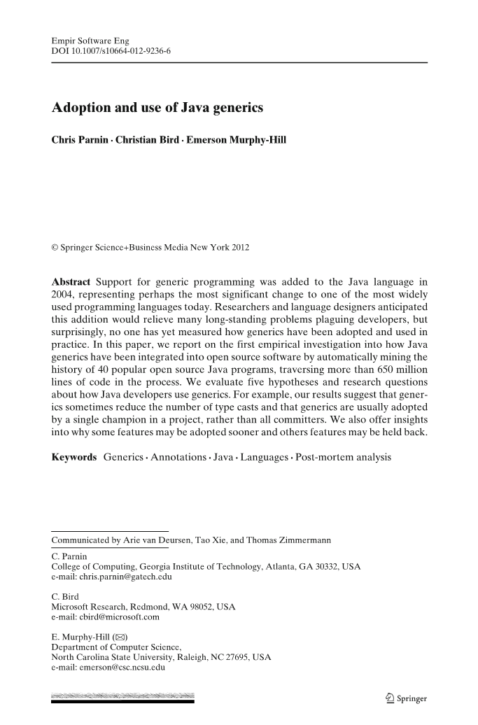 在本文中,我们研究了作为2004年的Java版本5而引入的泛型的采用和使用。我们首先看看例如类型声明、类型安全集合、通用方法、通配符等Java泛型的特性如何在真正的项目中被引入和使用。 凭借此研究后七年的好处,我们调查了预测、断言以及最初由研究和工业所作出的声明如何在野外展开。 此外,我们调查了采用的过程和时间表:采用旧代码的情况如何,谁来购买,这些功能多久被采用,以及有多少项目和人员忽略新功能?该结果使我们能够调整关于开发人员将如何采用未来语言功能的期望。