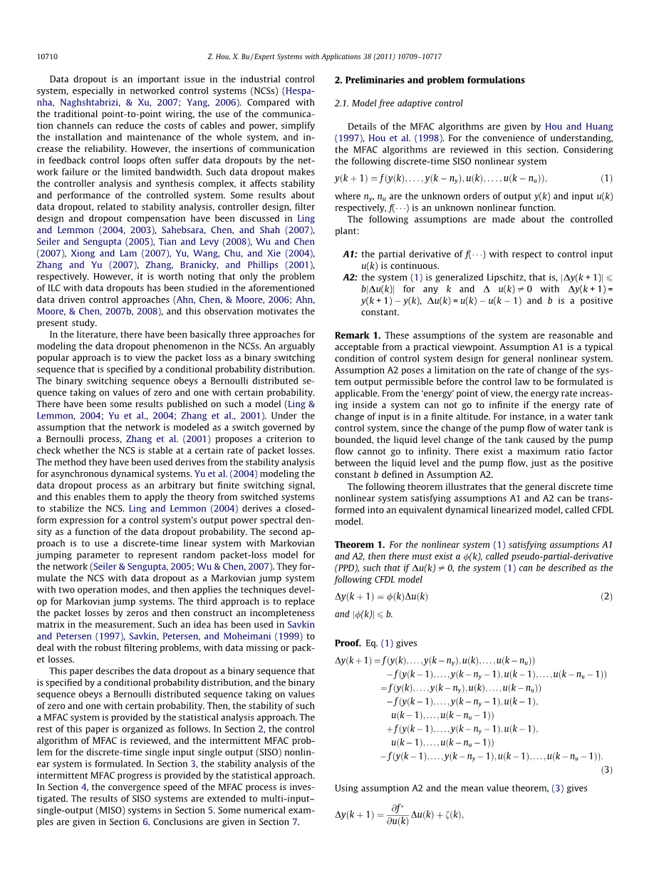 及连接所有这些组件的网络。在这种情况下,由于传感器,执行器或网络故障,这就是所谓的间歇性MFAC。 因此,当说到间歇性MFAC时,两种不同类型的数据丢失是合理的,第一个发生在控制输入更新时。在通过网络进行控制信号转换的过程中,信号可能因执行器故障,网络故障或数据冲突而丢失。第二个数据丢失是由于由传感器或网络故障引起的从传感器到控制器的信号传输过程中的测量数据丢失。在本文中,只有第二种情况(间歇测量)被认为是现有的最多的研究(Ahn等, 2006; Seiler和Sengupta, 2005; Sinopoli, Schenato,Franceschetti和Poolla, 2004; Smith和Peter, 2003; Wang, Ho和Liu, 2003; Wu和Chen, 2007; Yu等, 2004; Zhang等, 2001).