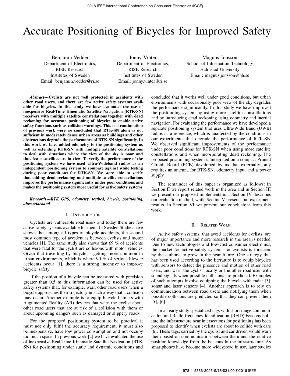 后来的一项研究建议使用安装在自行车把手上的智能手机。由于智能手机是唯一的设备,在该研究中,它被用于定位与内置全球导航卫星系统(GNSS)接收器和通信使用内置的互联网连接。定位精度达到5 m左右,通信延迟在500 ms左右,驾驶员接近交叉口,延迟补偿和地图知识,能够预测一个十字路口的车辆碰撞时可能发生的碰撞。骑自行车的人。然而,智能手机的定位不够准确,无法确定简在哪个自行车上,这在很多情况下是有限制的。此外,他们进行实验的路线有比较好的天空观,这是他们使用RTK-SN作为参考定位系统的要求。他们还得出结论,智能手机的定位性能下降太多,以防碰撞预测时,穿在口袋里,这意味着智能手机必须连接到自行车的把手。