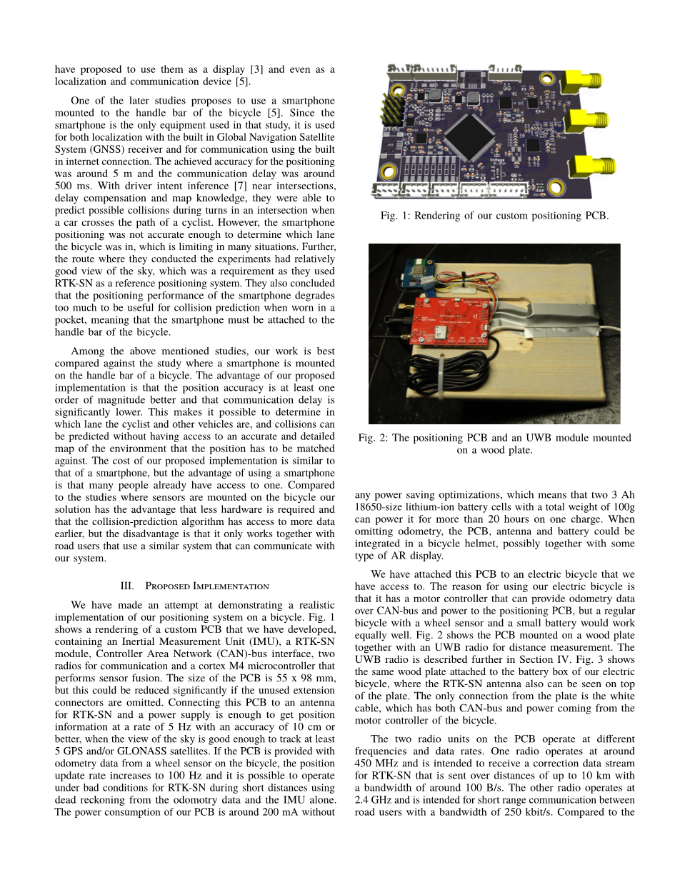 在上述研究中,我们的工作与智能手机安装在自行车把手上的研究相比是最好的。我们提出的实现的优点是位置精度至少是一个数量级,并且通信延迟显著更低。这使得能够确定骑车人和其他车辆在哪个车道上,并且碰撞可以被预测,而无需访问位置必须匹配的环境的精确和详细地图。我们提出的实施成本与