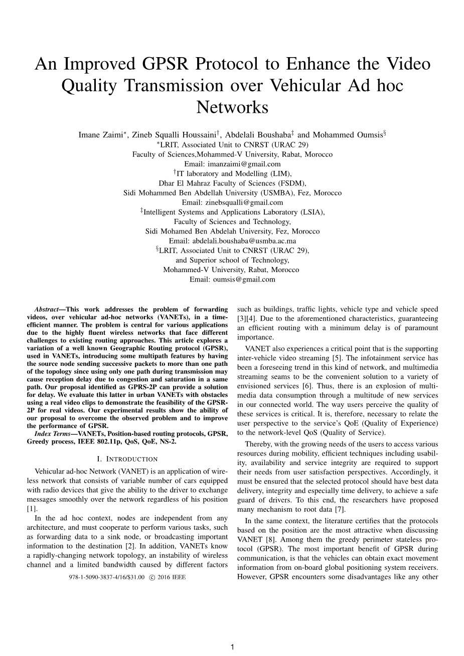 索引术语:VANET,基于位置的路由协议,GPSR,贪婪转发,IEEE 802.11p,QoS,QoE,NS-2