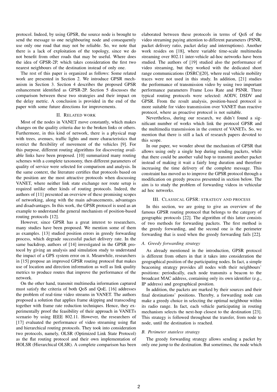 在同样的背景下,文献证明在讨论VANET时,基于位置的协议是最有吸引力的[8]。 其中包括贪婪的周界无状态协议(GPSR)。 GPSR在通信过程中最重要的好处是车辆可以从机载全球定位系统接收器获得精确的运动信息。但是,GPSR也有其他缺点,实际上,通过使用GPSR,源节点被发送消息到一个相邻节点,因此只使用一条可能不可靠的道路。 所以,我们注意到拓扑结构的缺乏,因为我们没有从其他可能有用的道路中受益。 GPSR-2P的想法在哪里考虑到目的地的前两个最近的邻居而不是只有一个。本文的其余部分组织如下:第2部分介绍了一些相关工作。第3部分介绍了GPSR机制。第4部分描述了GPSR增强GPSR-2P。 第5节讨论了这两种策略之间的比较以及它们对时延度量的影响。 本文最后提供了一些结论,并提出了一些改进方向