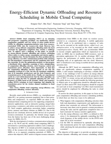 据我们所知,这是首个通过考虑本地计算中的CPU时钟频率控制和在云计算中传输功率分配,在完成时间期限限制和任务优先级要求下,将能耗和应用程序完成时间降到最低的动态卸载和资源调度的论文。