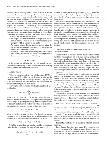 半监督学习模块通过自我训练学习领域内知识。以前的工作主要集中在从未加注释的语料库[14],[15]中学习单词表示法。例如,Peng和Dredze[15]联合训练了关于NER和分词任务的模型,学习分词表示法。与以前的工作不同,我们提出了一个基于置信度的学习方法,通过自我训练探索域内无注释文本。为了建立训练对,在每个时期之前由受过训练的模型作出的预测被认为是未注释文本的gold标记。我们使用置信度来评估训练对的正确性,并在未注释的语料库中调整每个训练对的学习率。置信度由置信度函数信计算。为了降低大量未注释数据的置信度计算成本,我们引入了一种基于每个未注释的句子与域内语料库之间的相似性来选择前k个未注释句子,每个未加注释的句子和一个领域内的语料库之间的一致性。