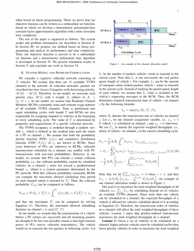 为了使单跳crn的长期系统吞吐量达到最大,研究了[5]中联合速率控制和信道分配问题。该工作已扩展到解决多跳crn的相同问题,以最大限度地提高SU的吞吐量,同时稳定[6]中的crn。然而,这些方法侧重于最大化系统的长期吞吐量,不能满足车辆的短期吞吐量最大化需求。此外,它们假定每个SU与一个统一的固定优先级相关联,而车辆的优先级则随其包的优先级而变化。在车辆网络中,由于相关应用的实时性要求,短期吞吐量最大化需求显得尤为重要。因此,长期效用最大化算法不适用于车辆网络。